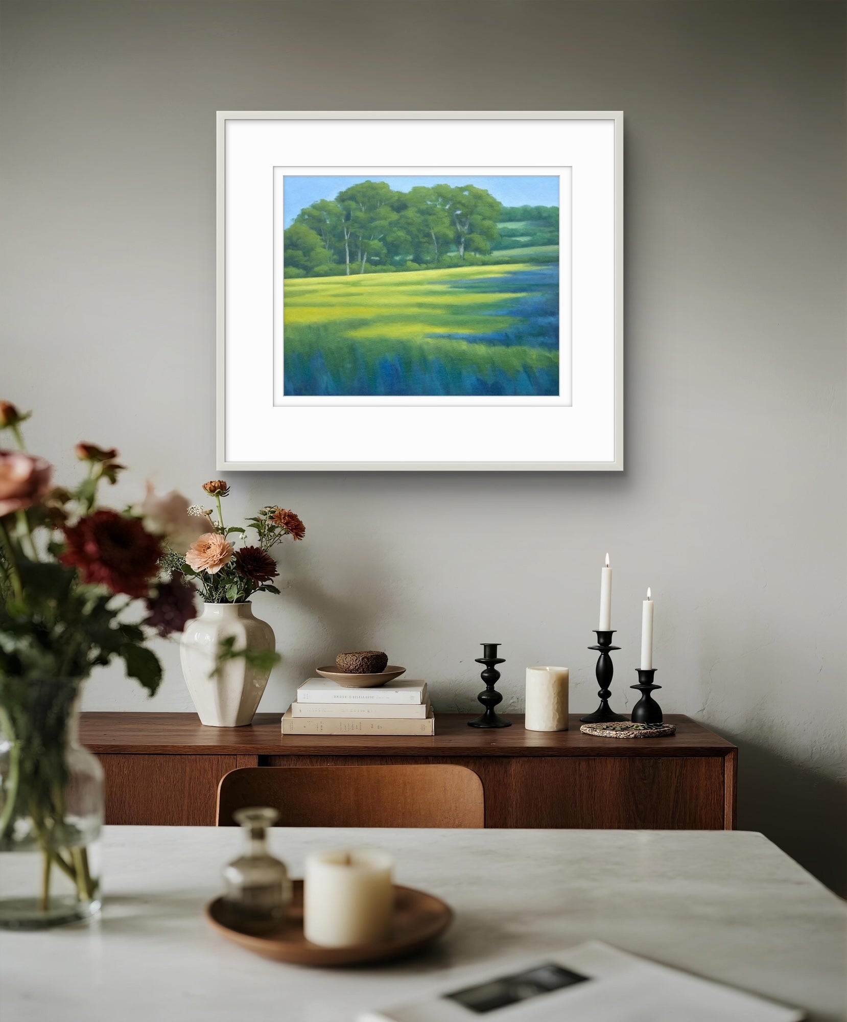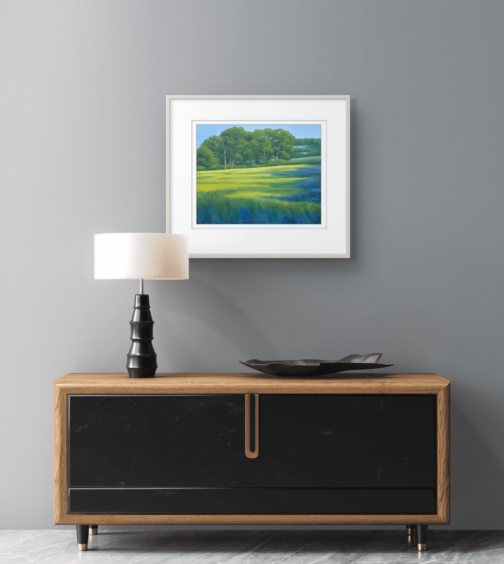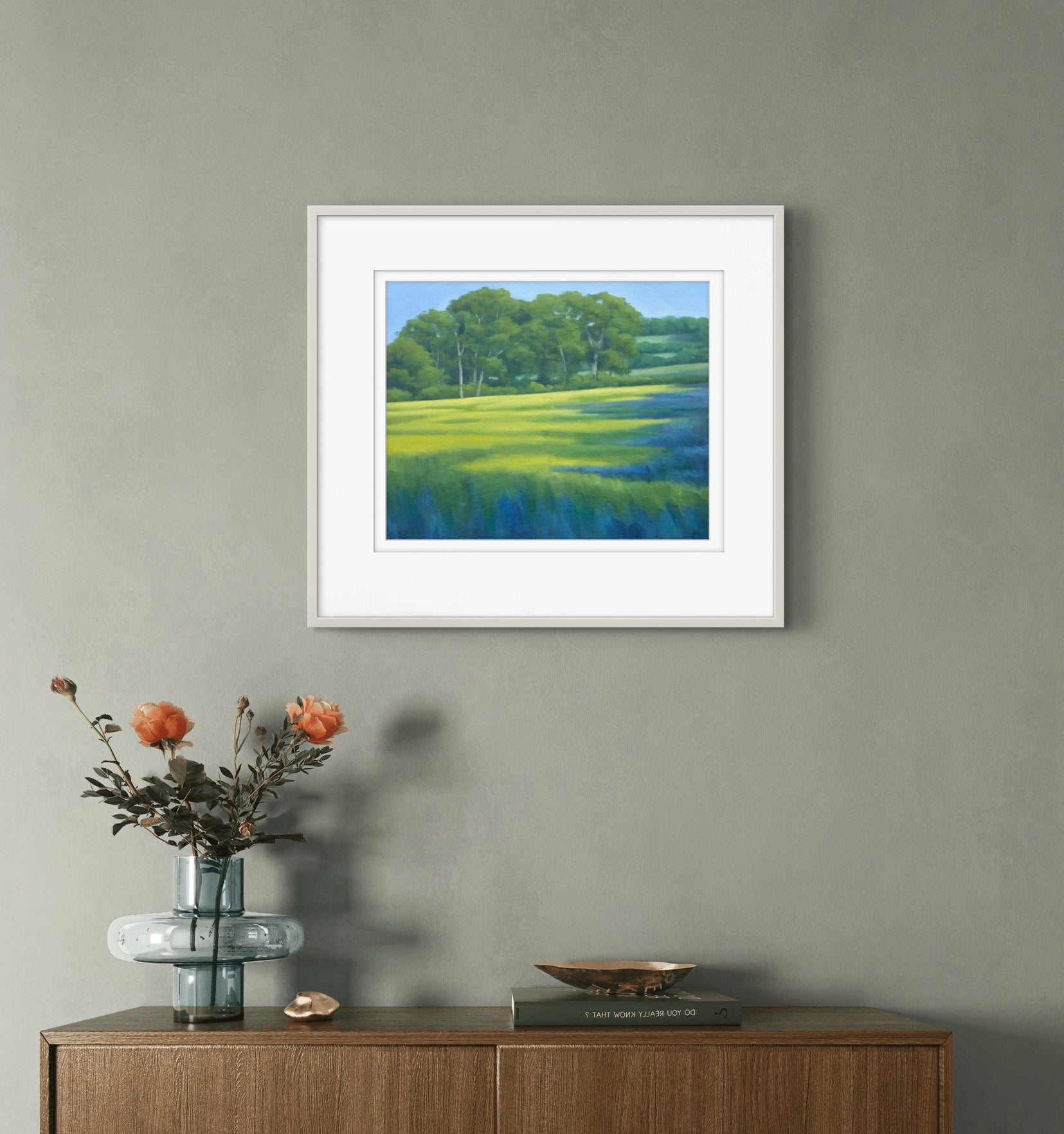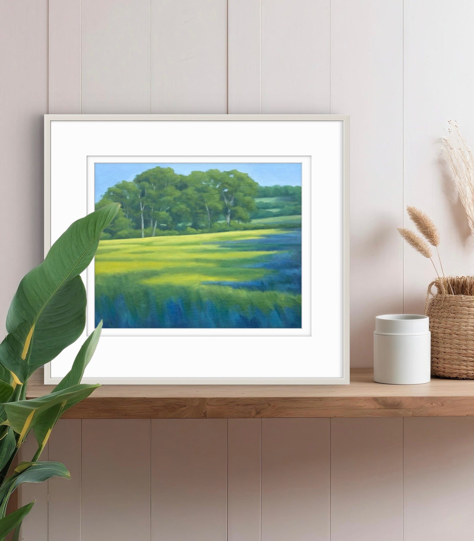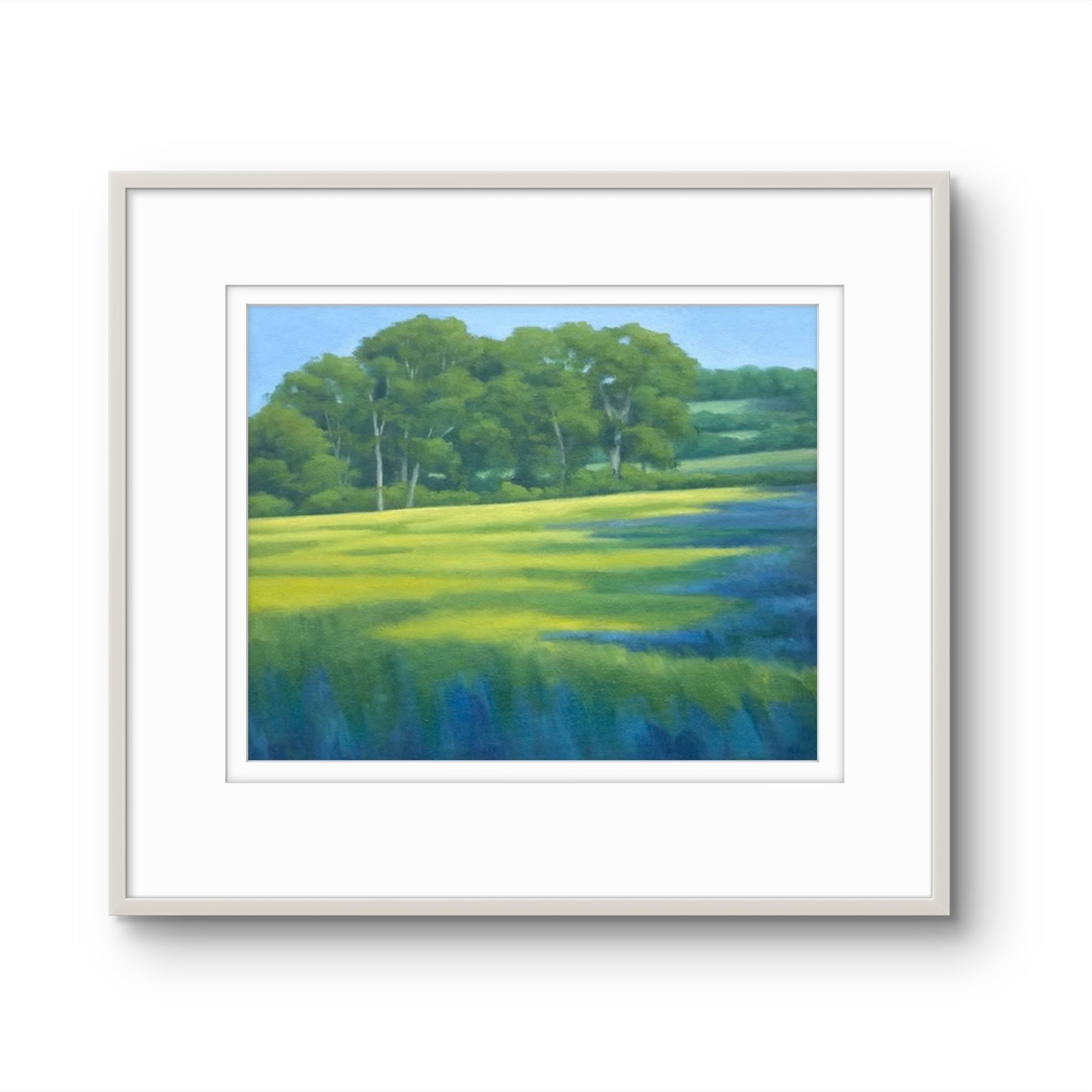 Fine Art Giclée Print of a Landscape with Green Fields and Trees, Purple Shadows, and Buttercups