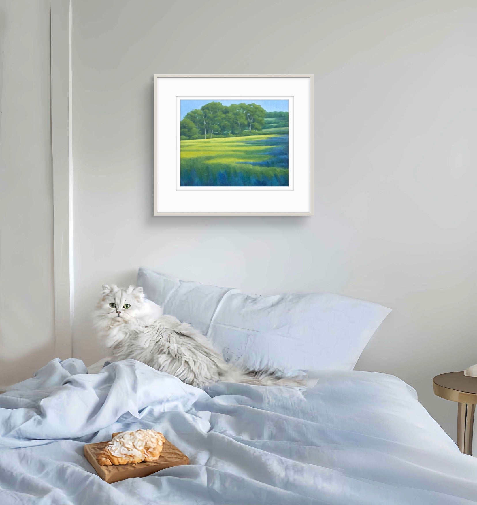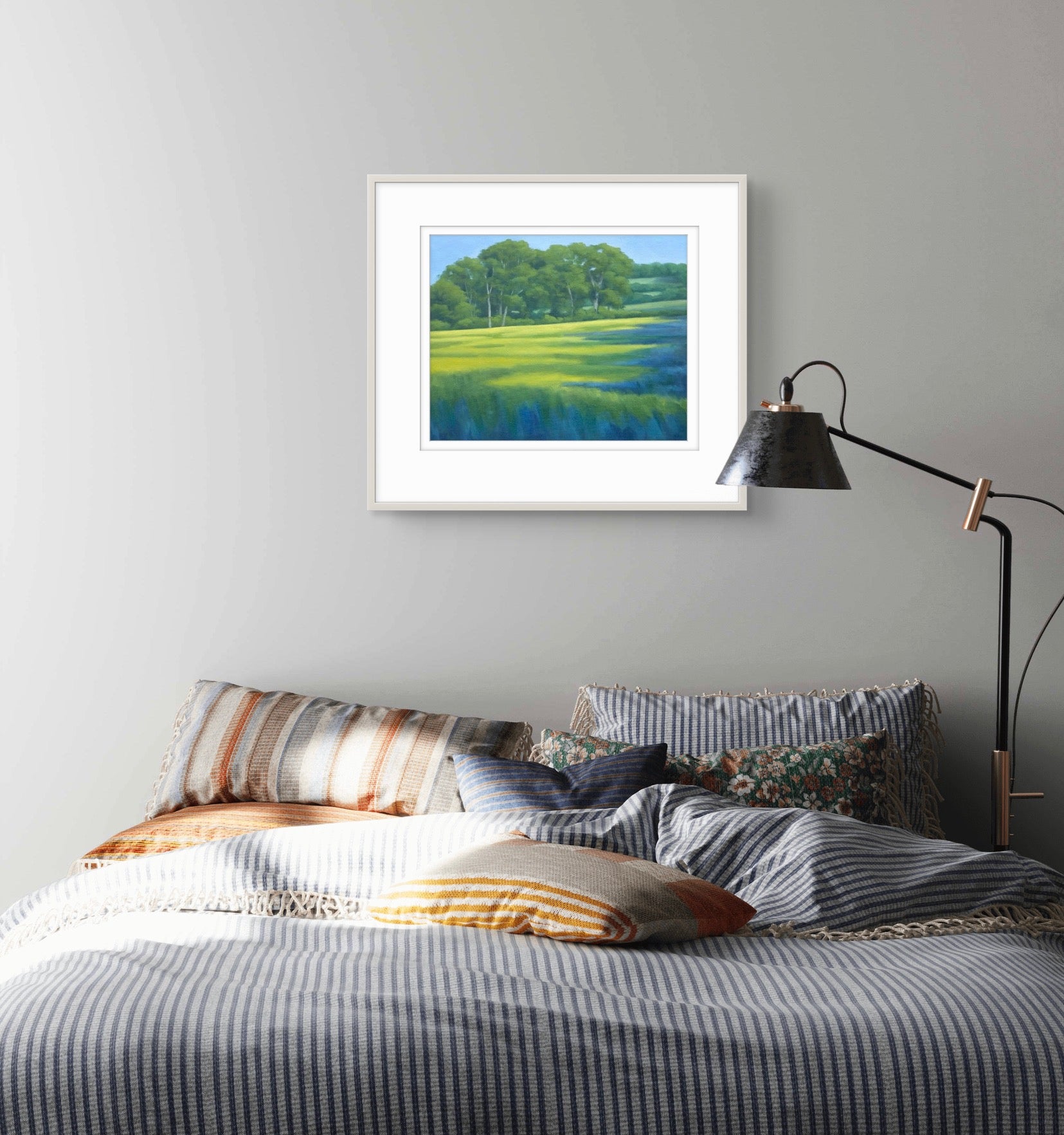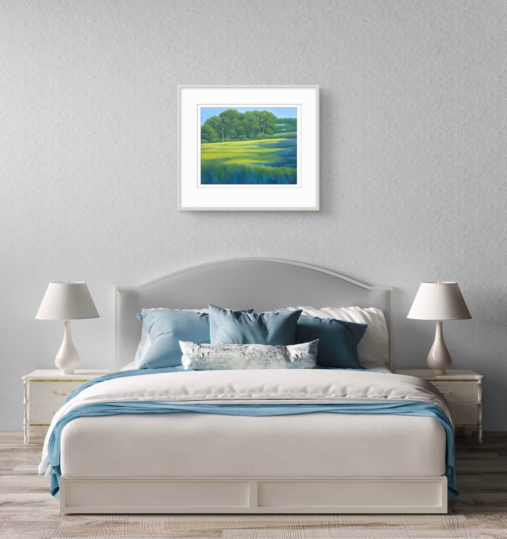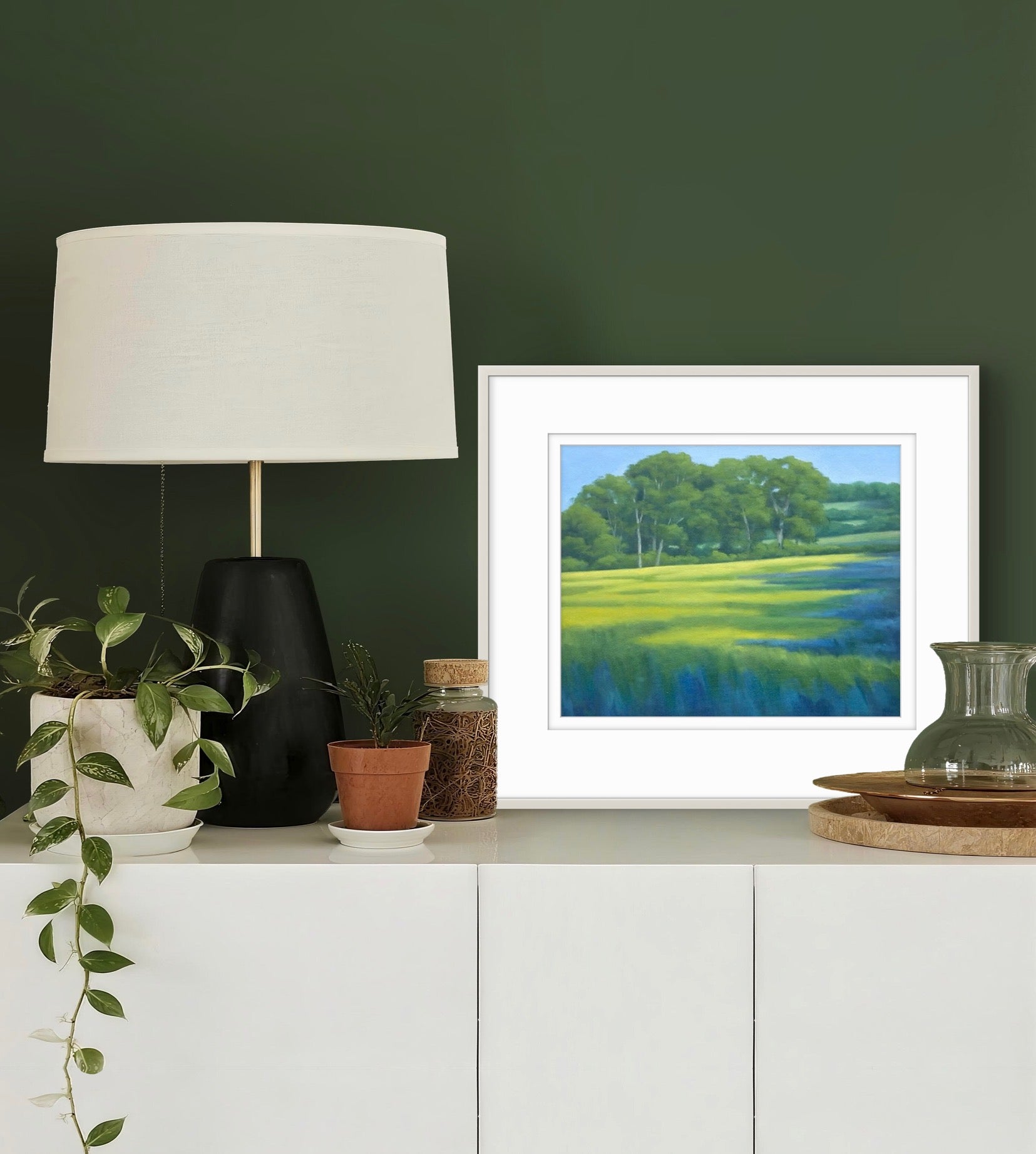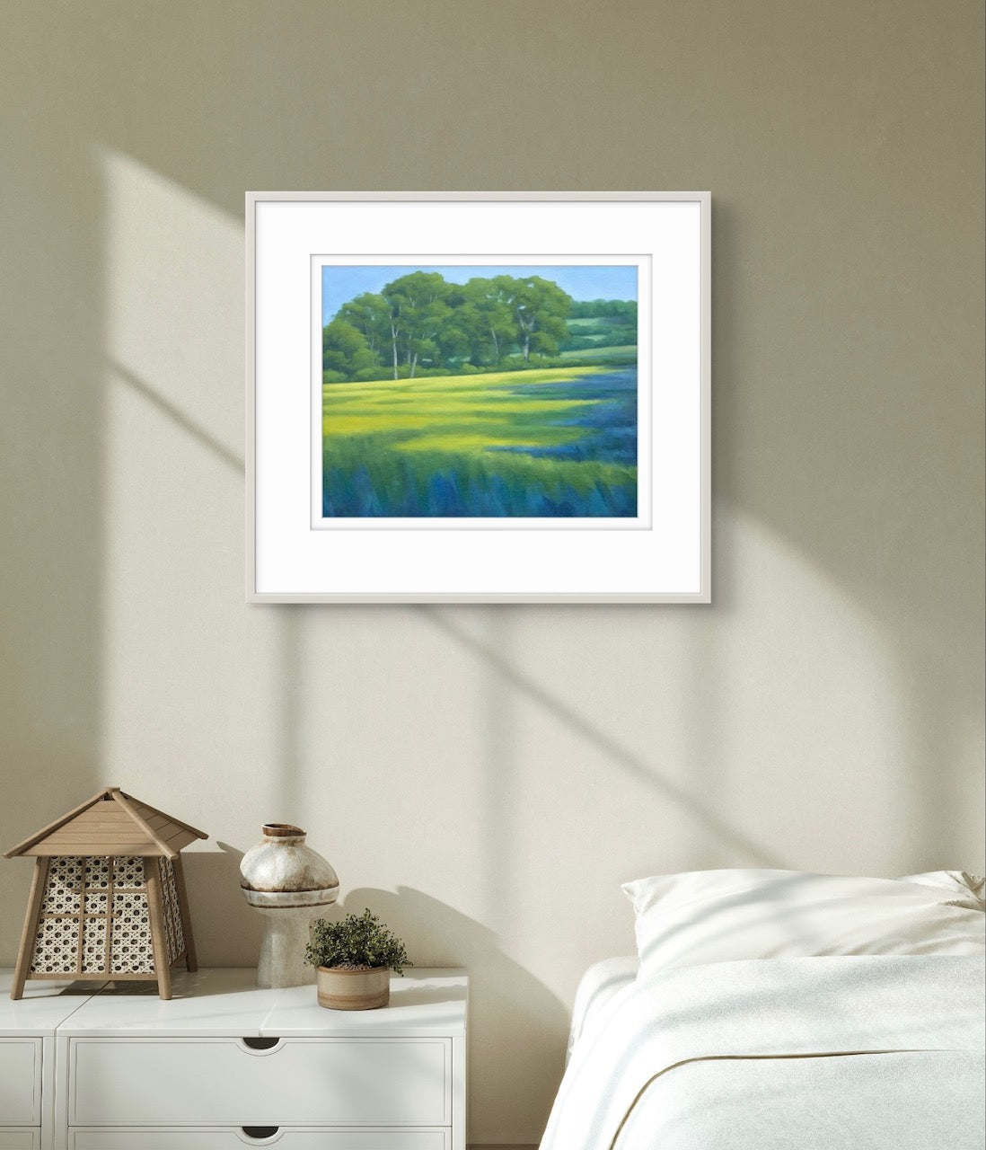 Fine Art Giclée Print of a Landscape with Green Fields and Trees, Purple Shadows, and Buttercups