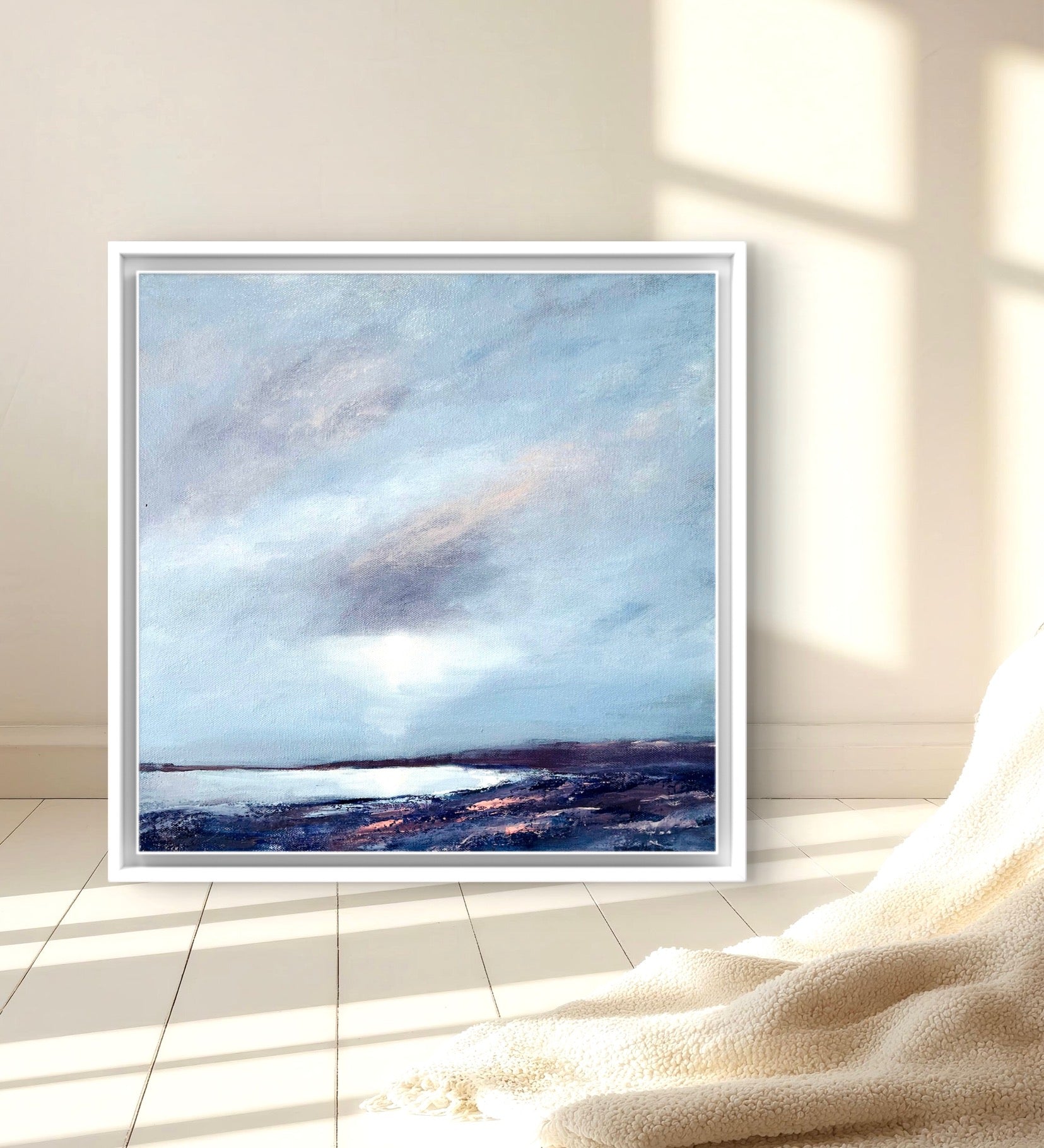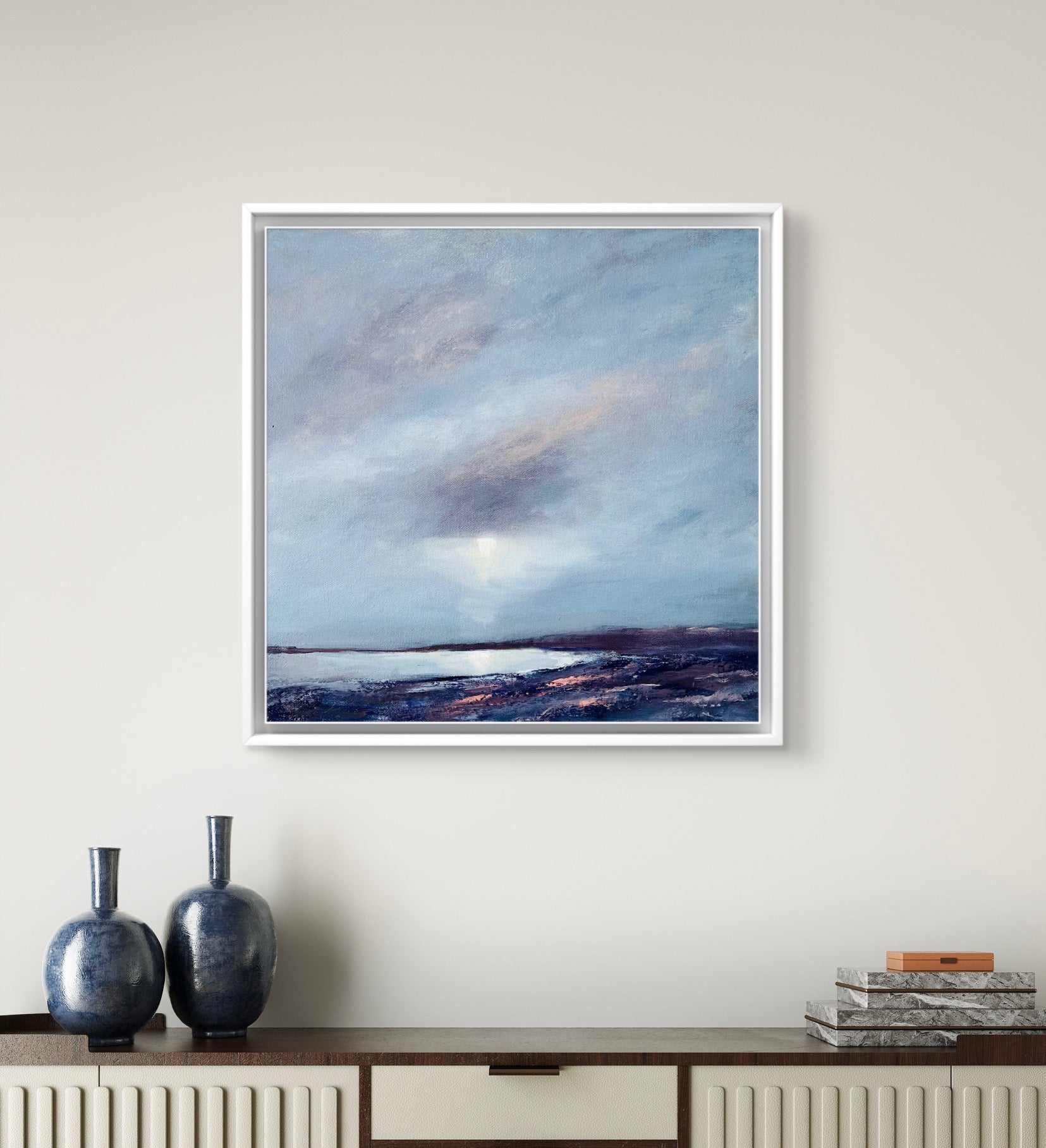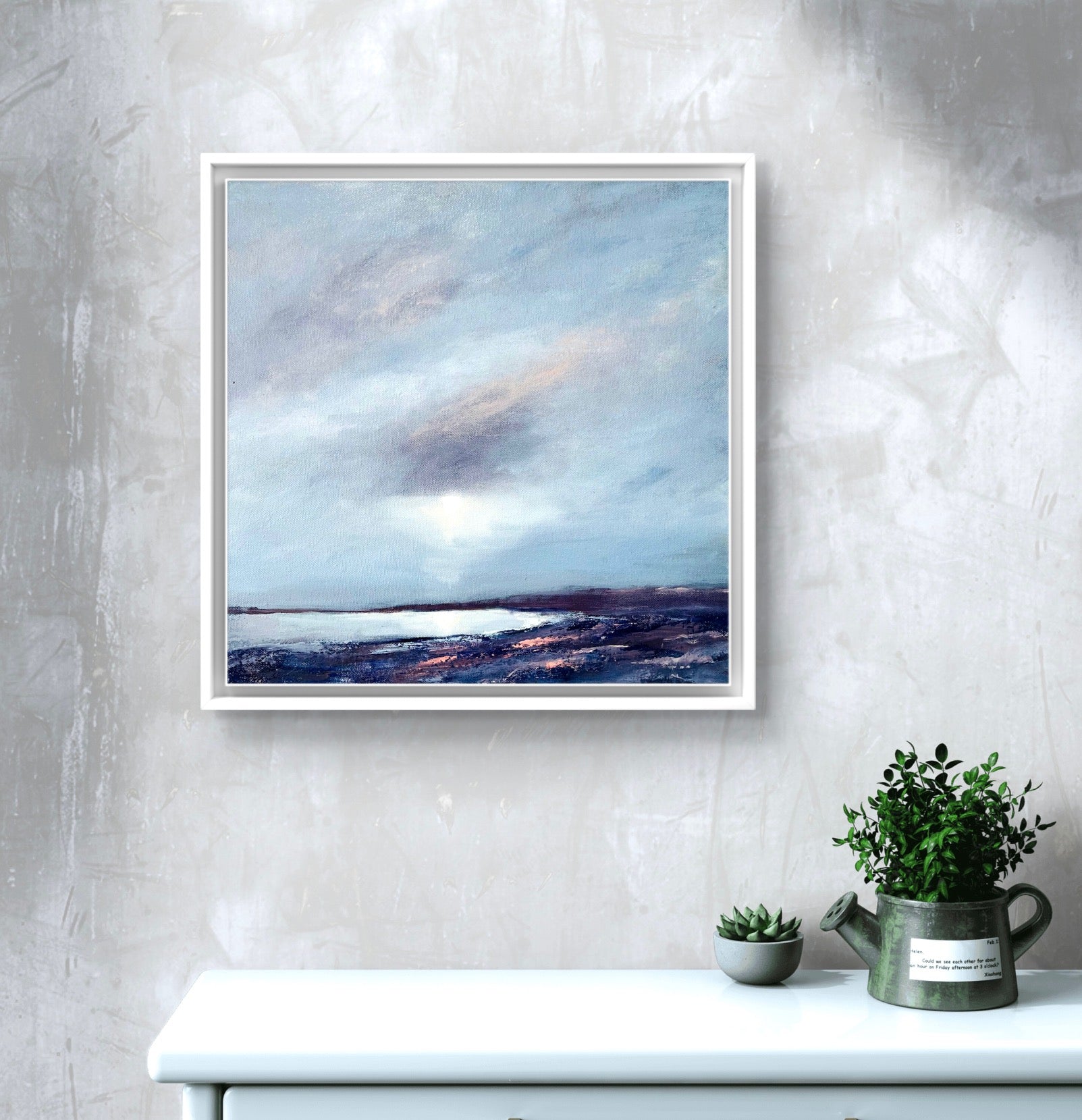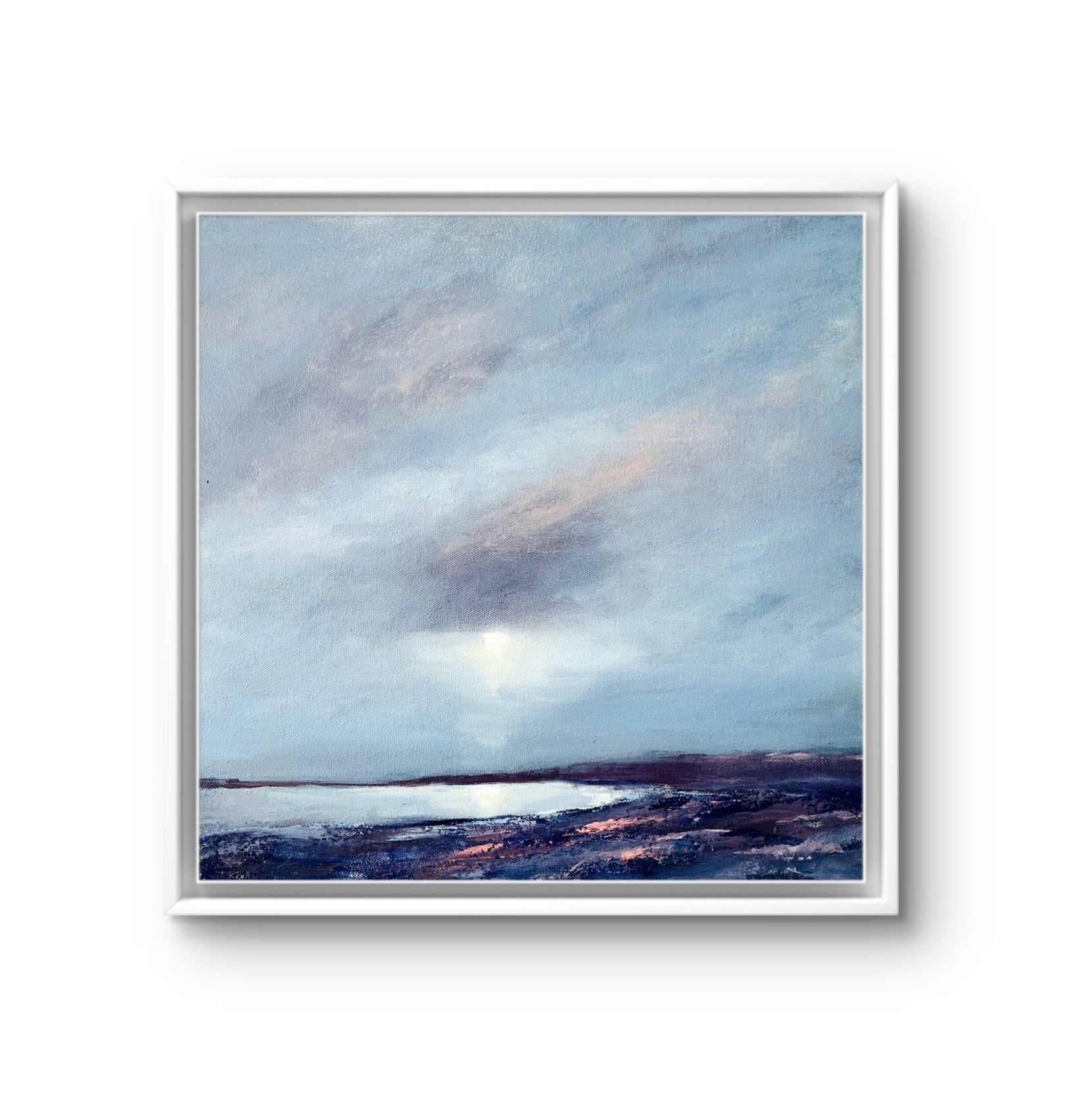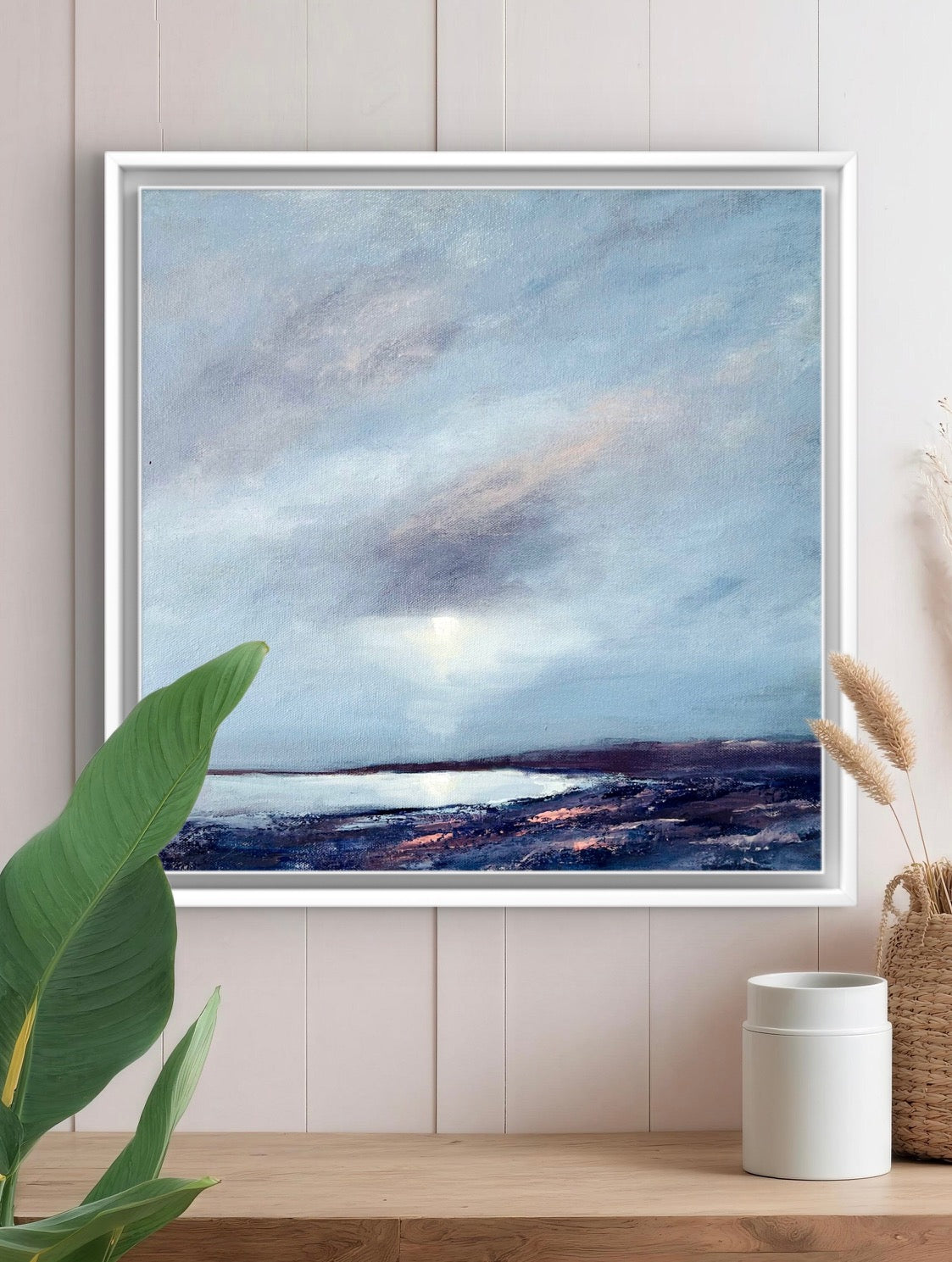 Painting of a landscape with a cloudy sky and a distant coastline.