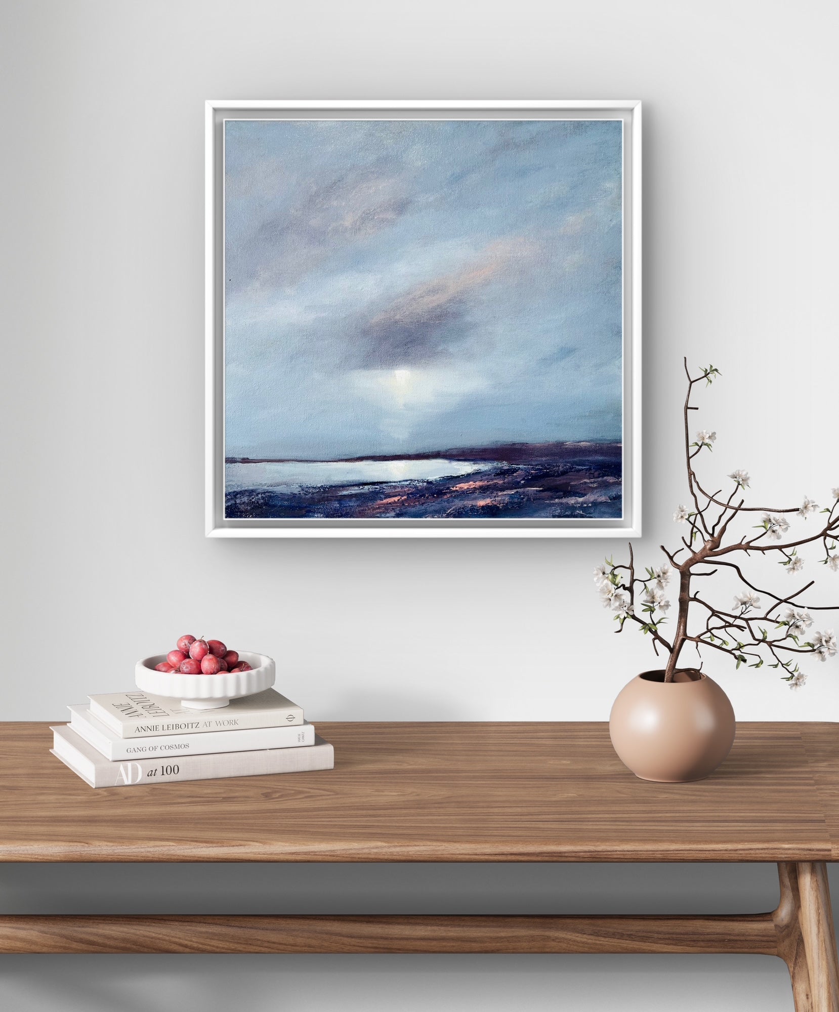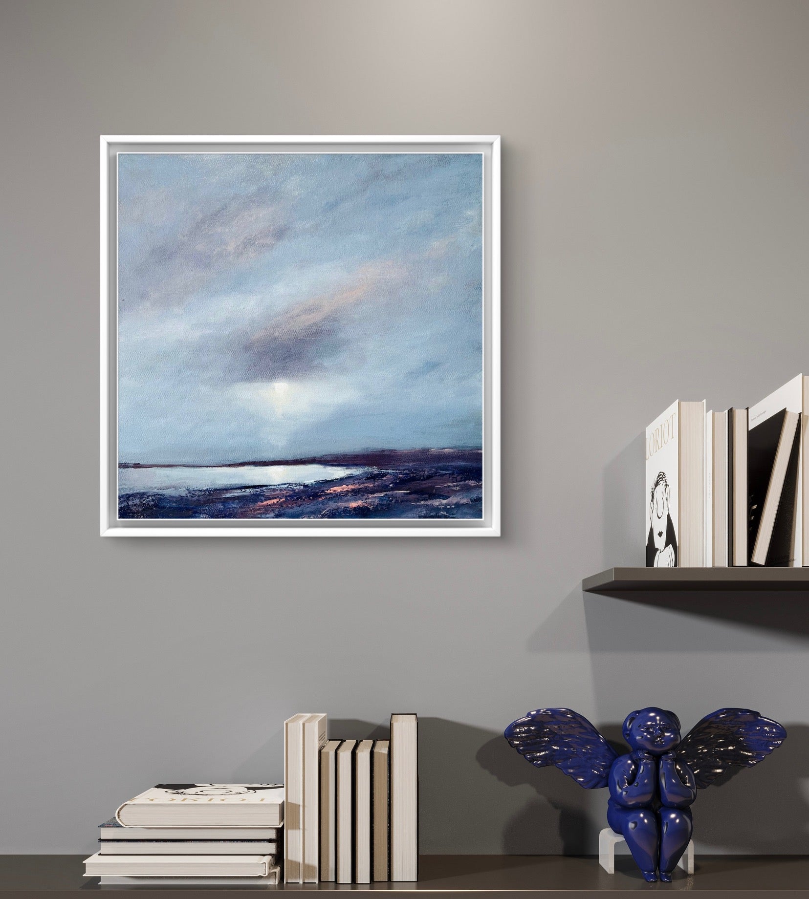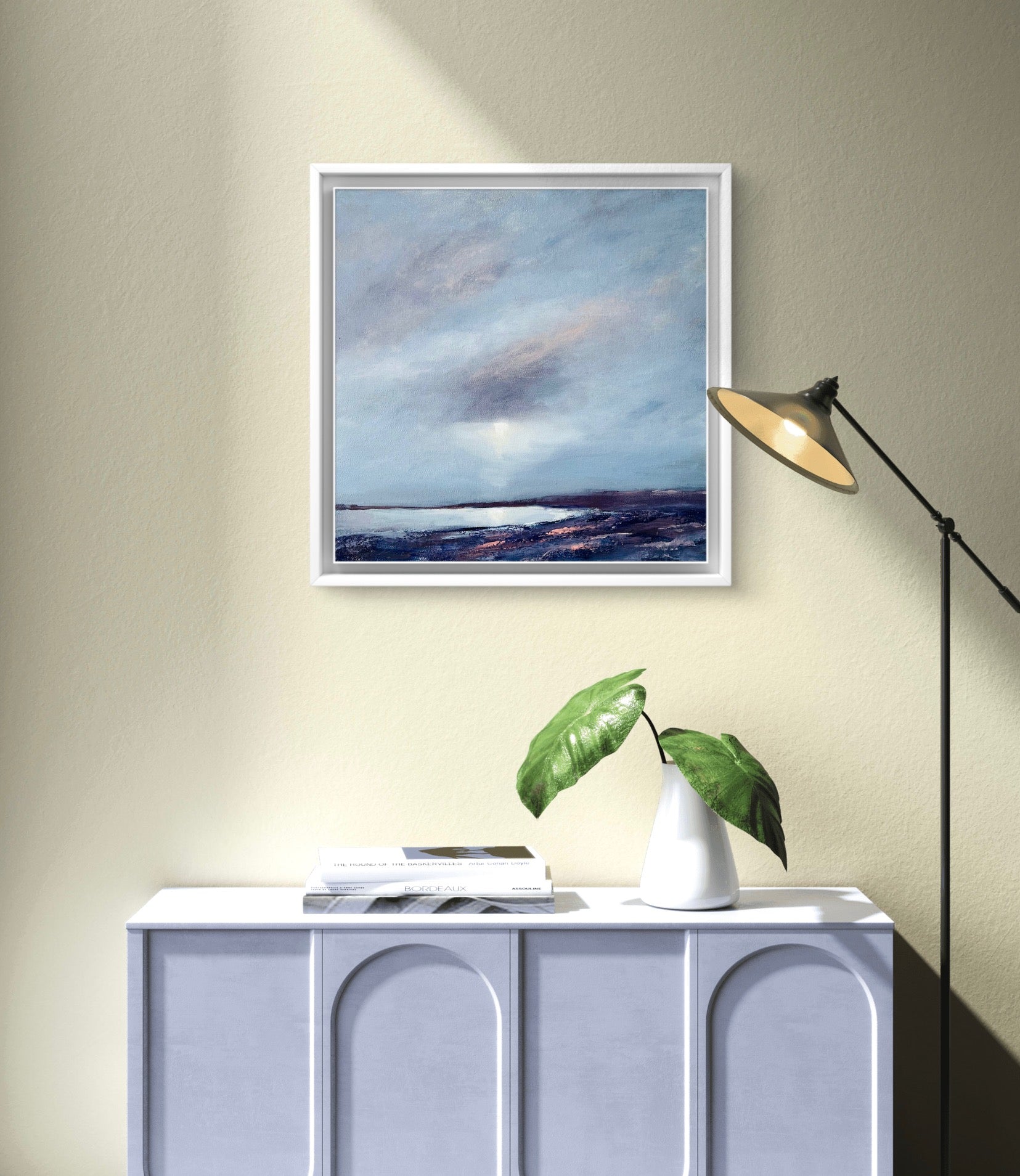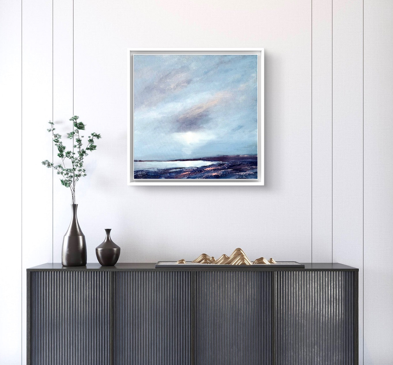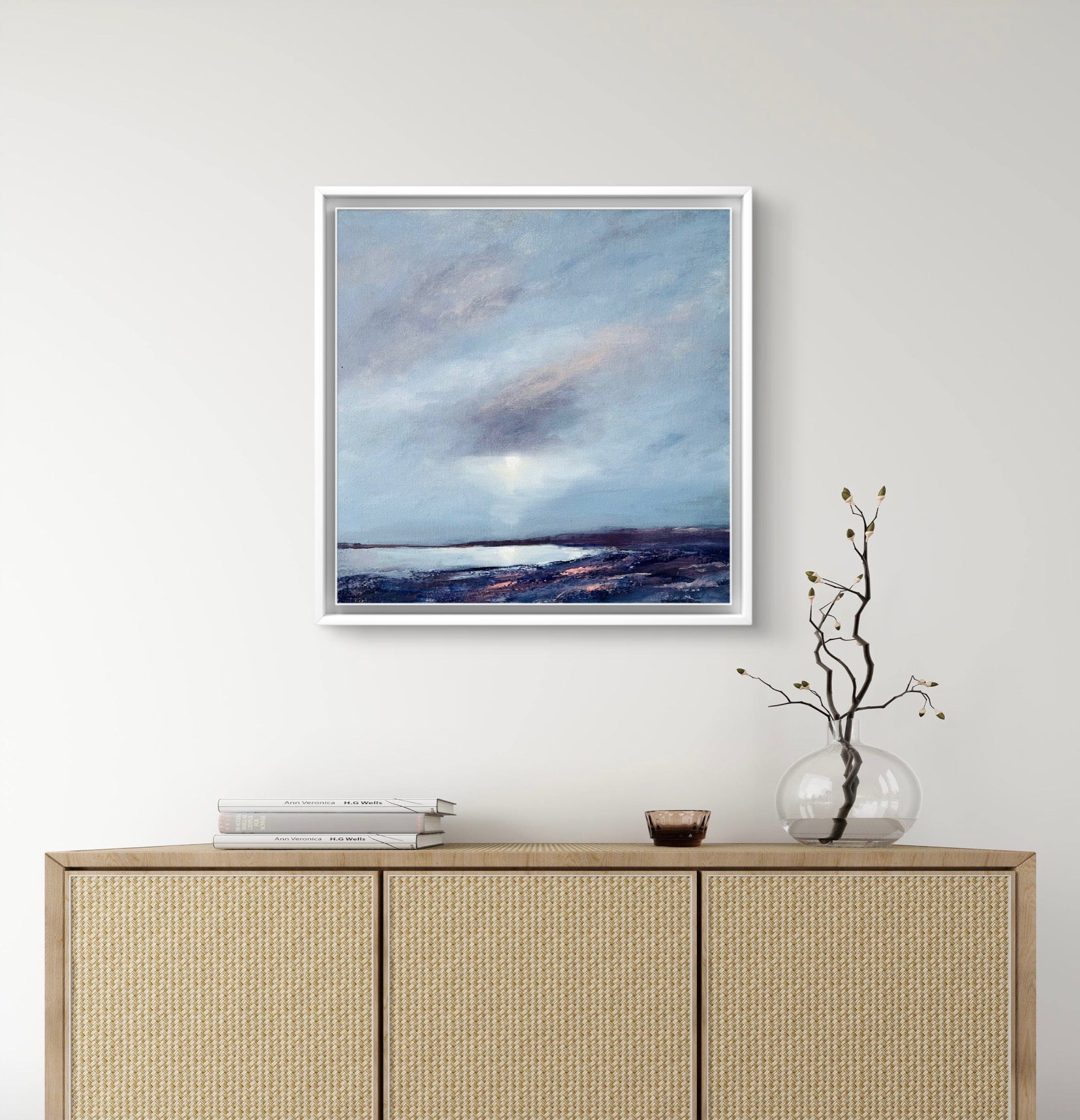 Painting of a landscape with a cloudy sky and a distant coastline.