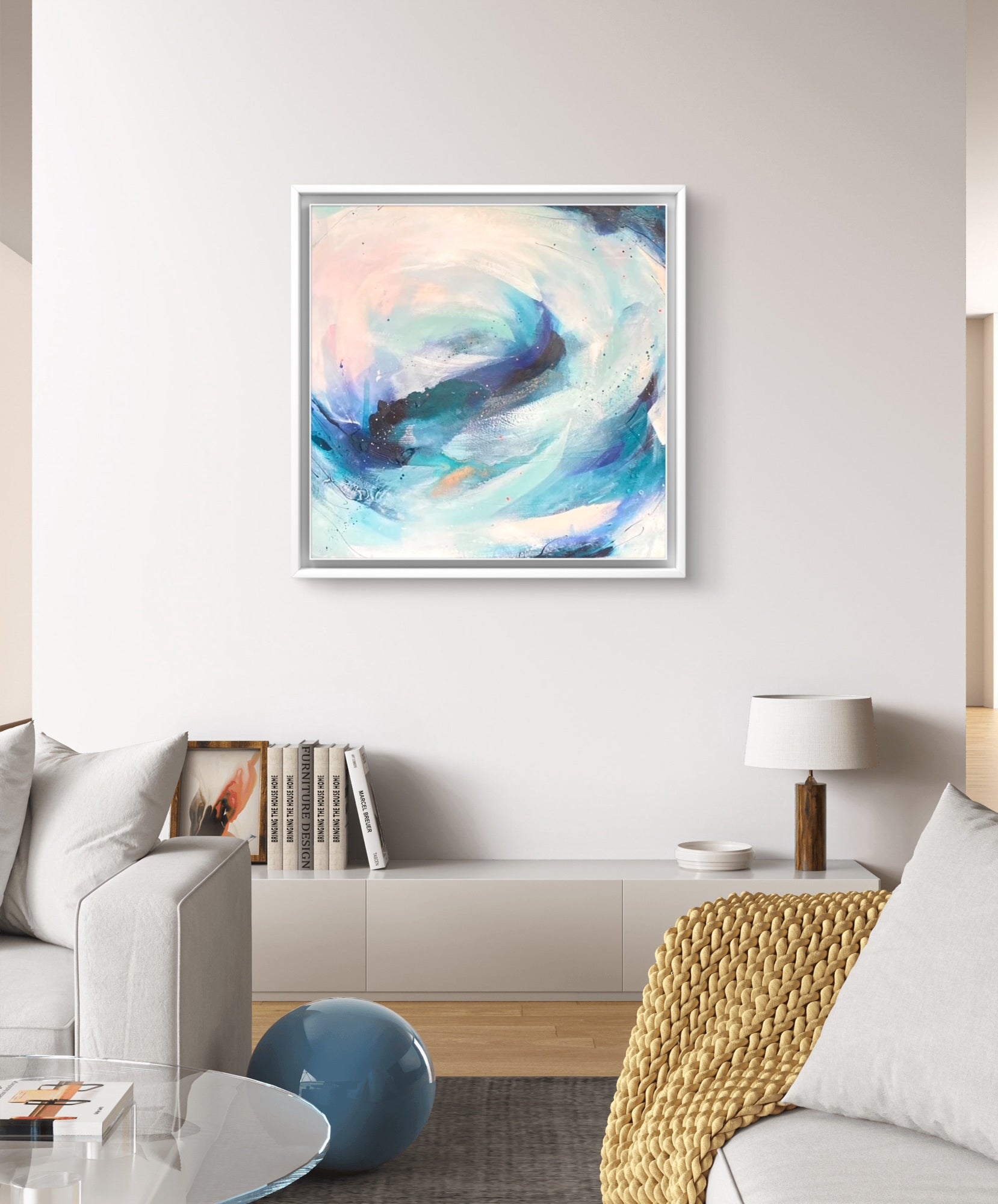 Dimension: 70 x 70cm depth 4cm, framed in a custom-made wooden tray frame.