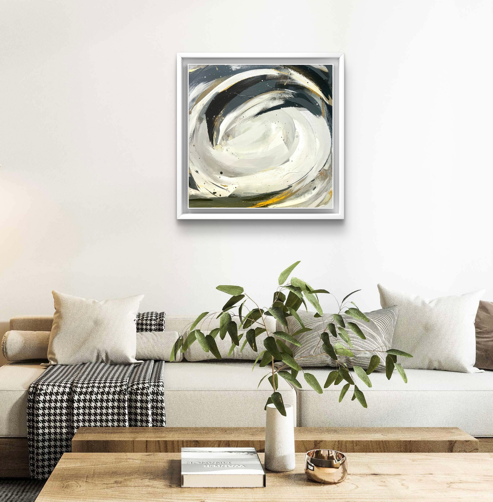 Framed in a white wooden tray frame.