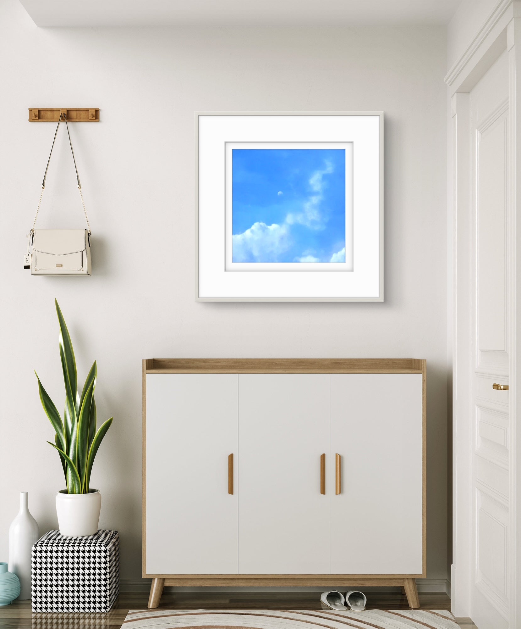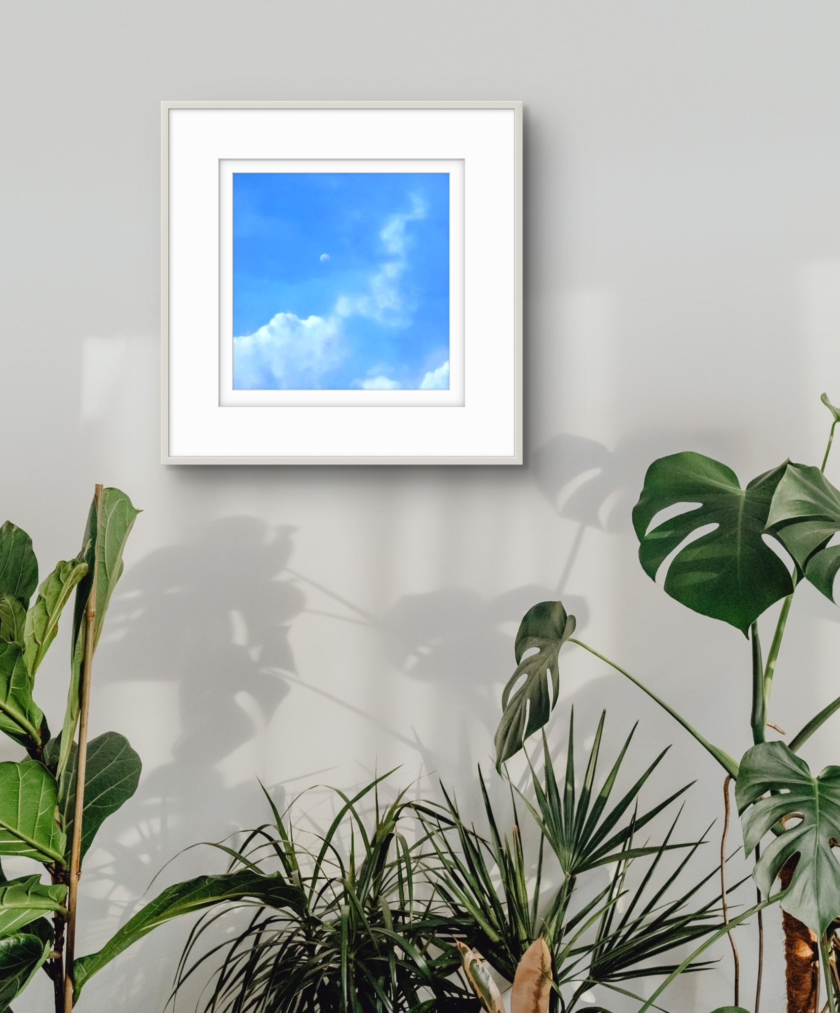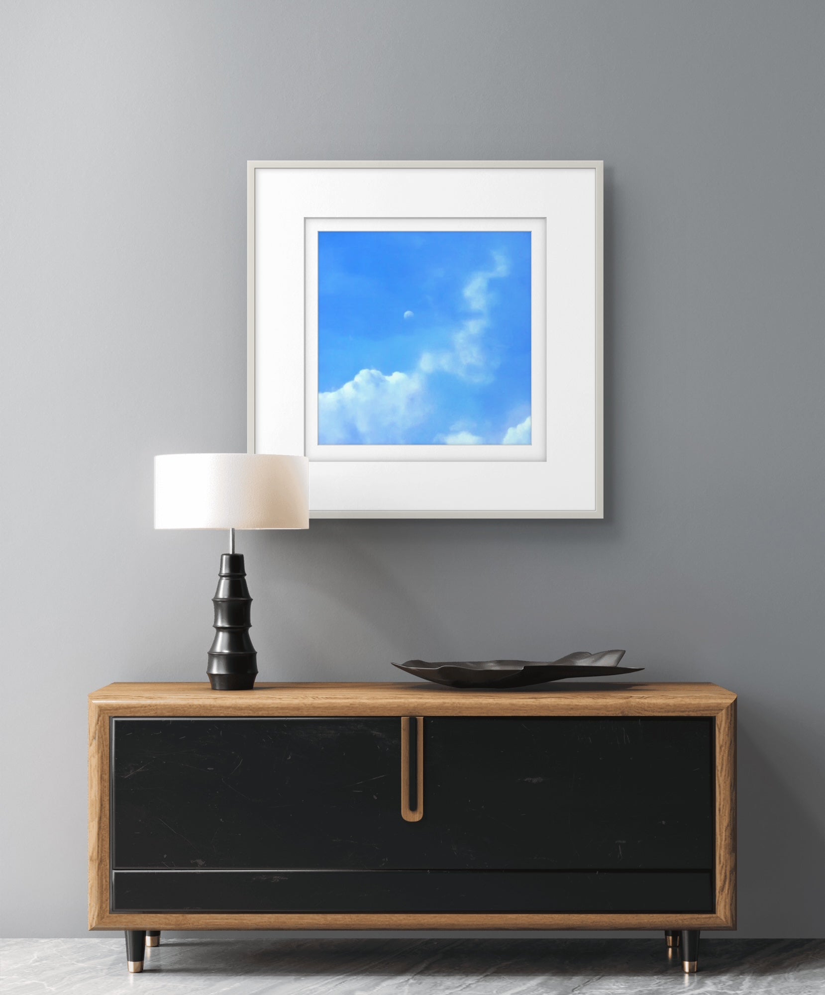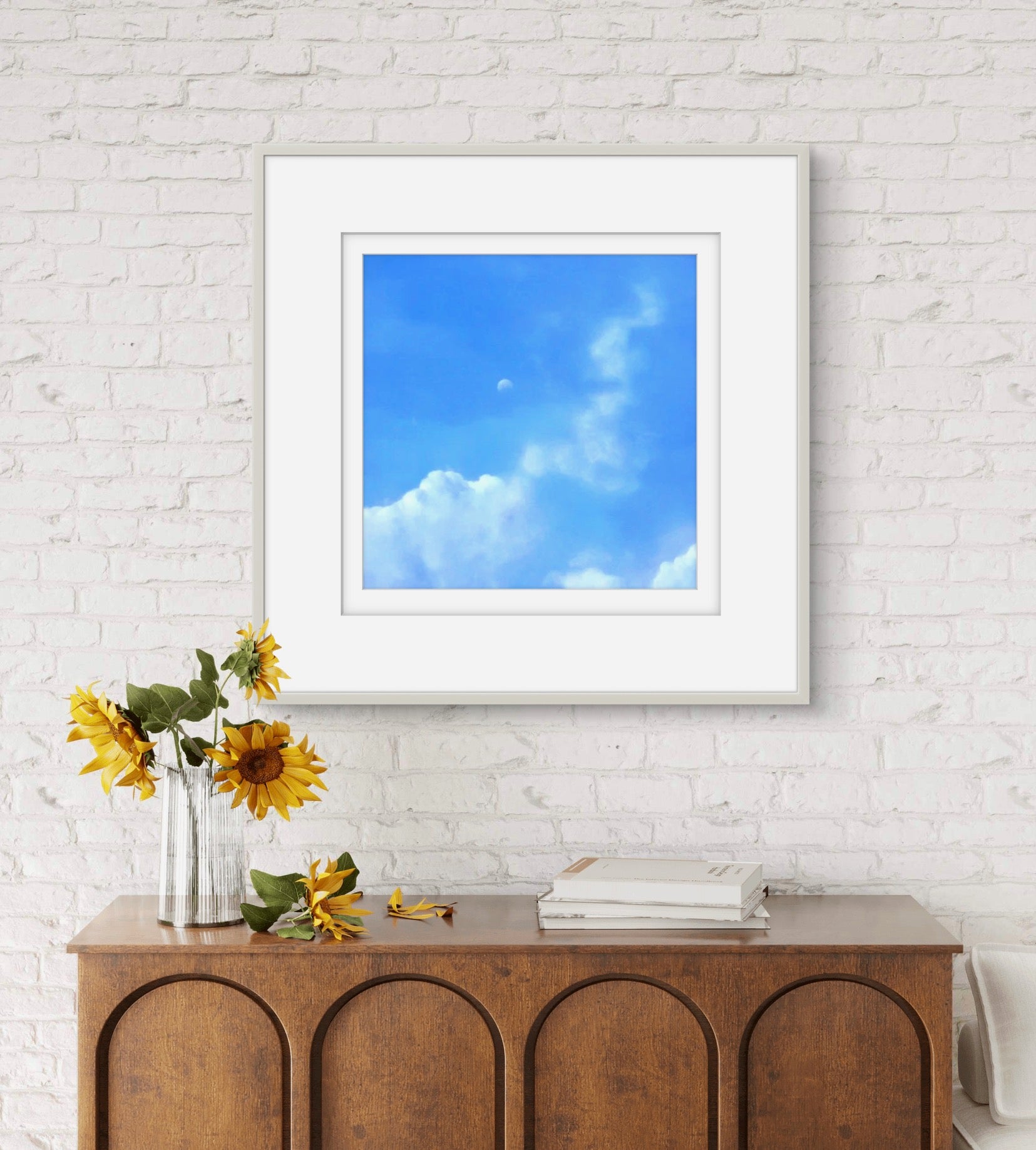 Fine Art Giclée Print depicting a view of the moon against a blue sky and clouds