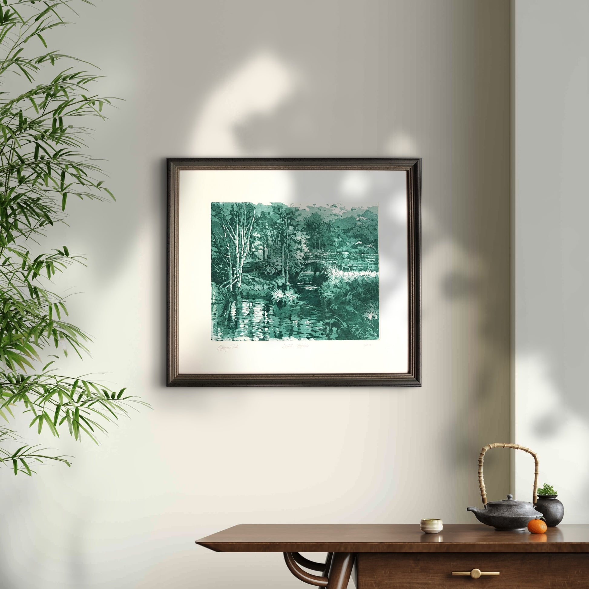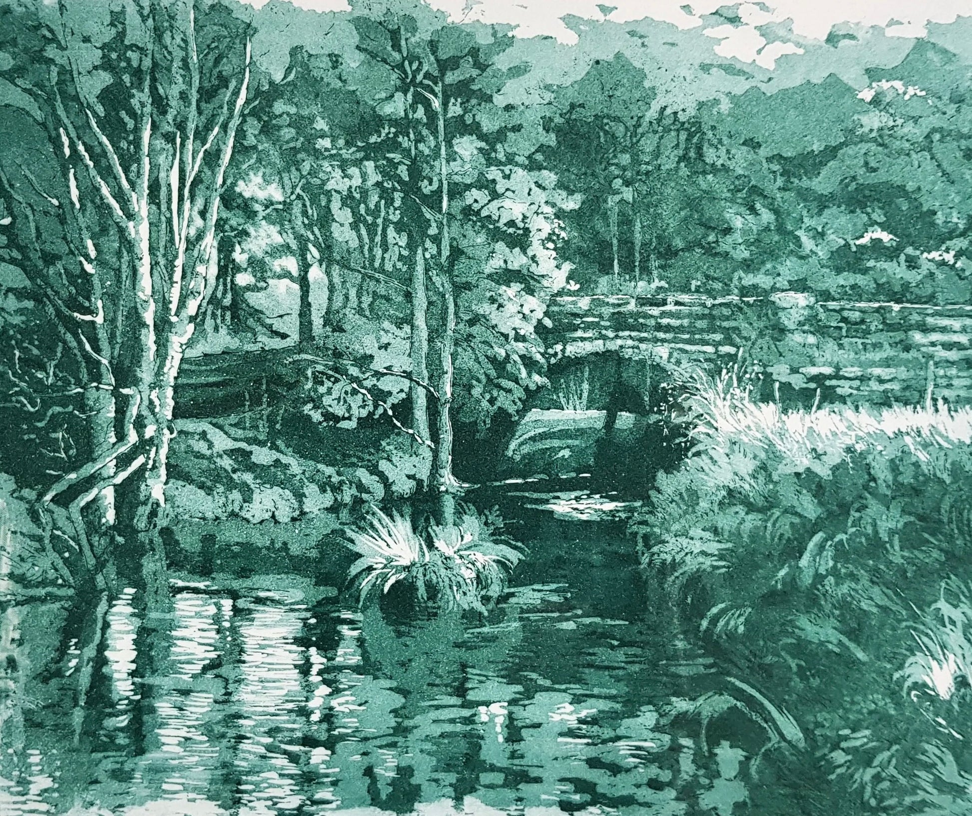 Woodland scene with a bridge over a stream, rendered in monochromatic green tones.