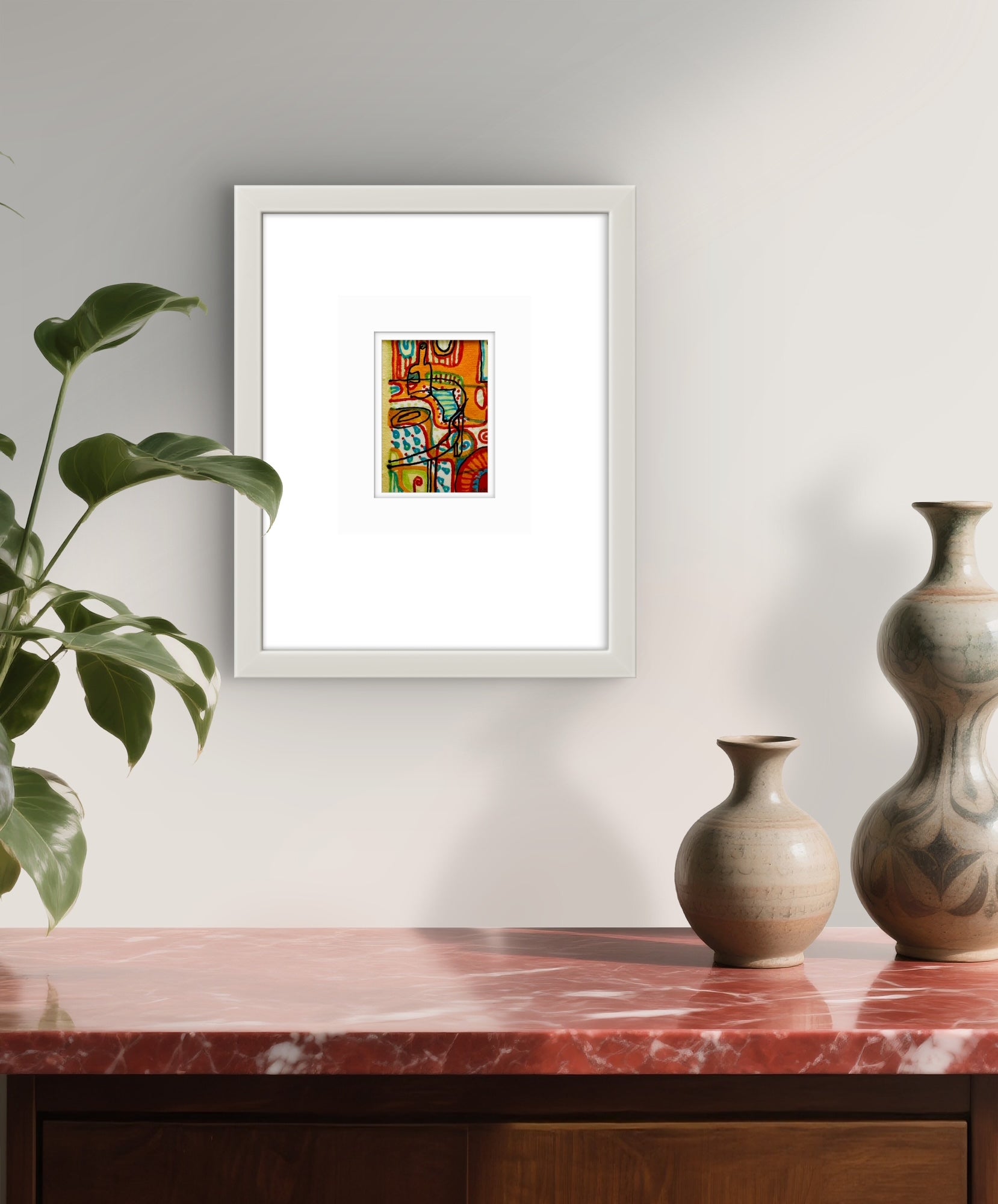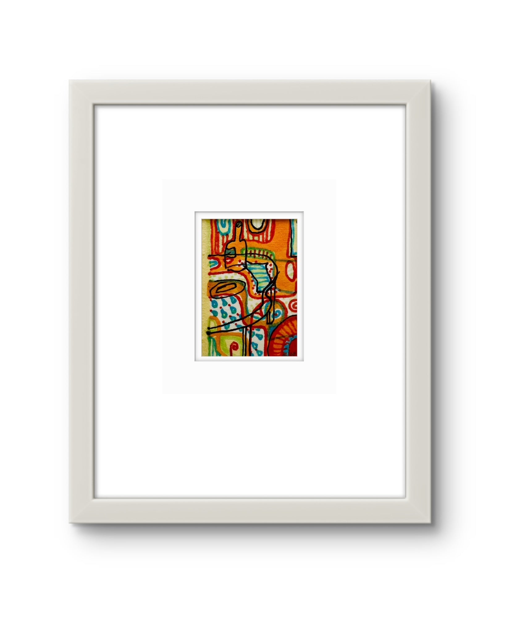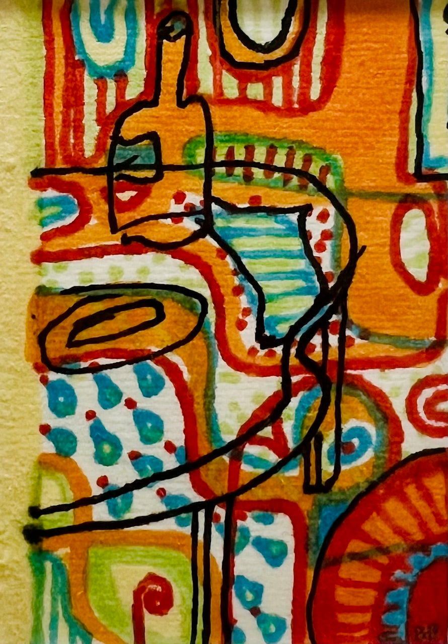 Abstract artwork with a stylized figure on a colourful background