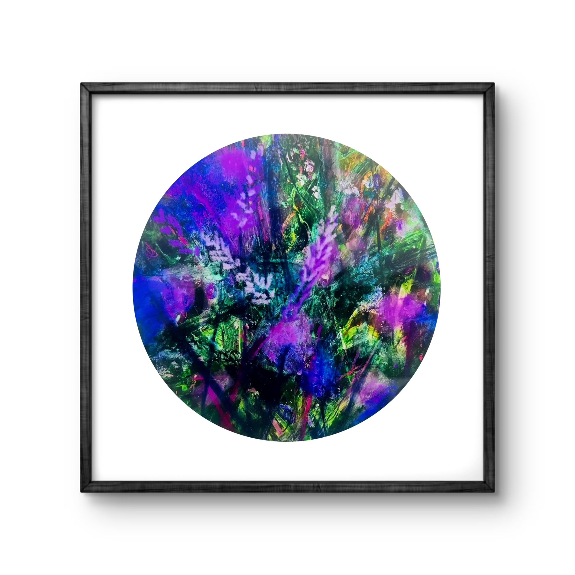Abstract, circular botanical print in vibrant blue, purple and green.