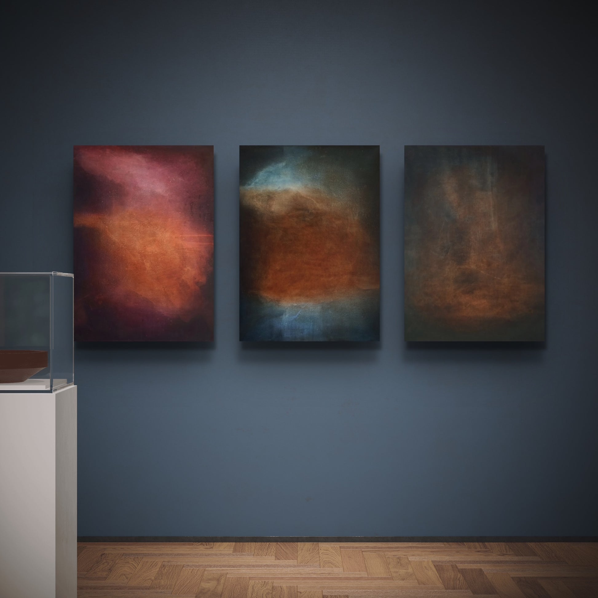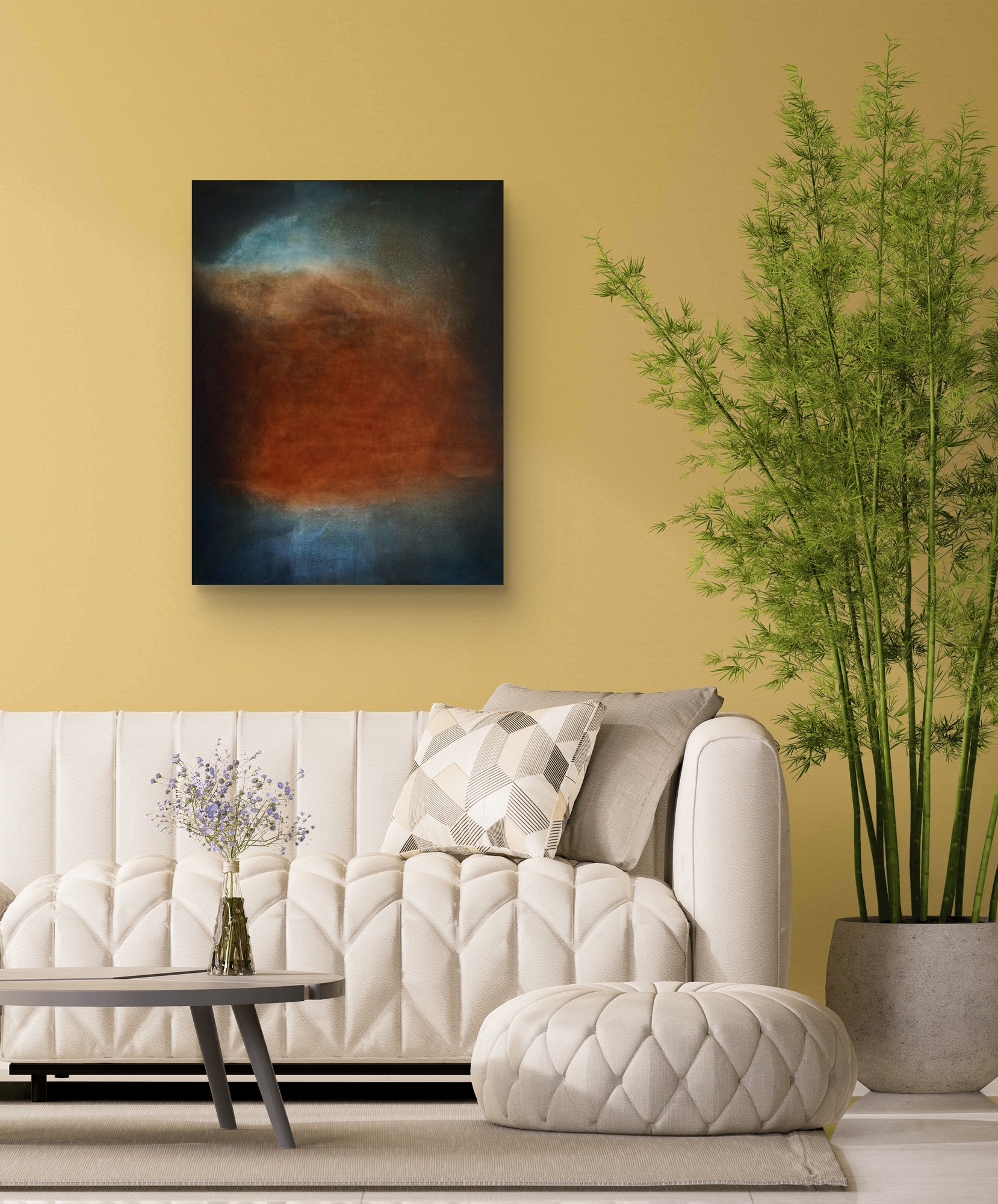Abstract oil painting on canvas with dark and light areas, with subtle shades of brown and blue