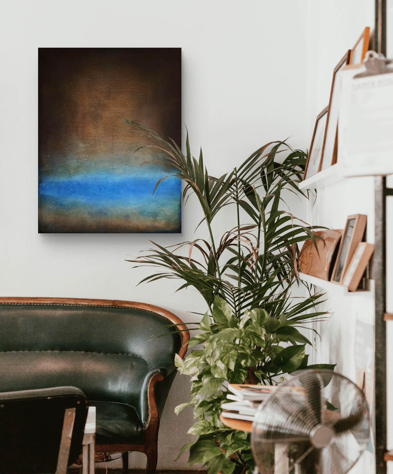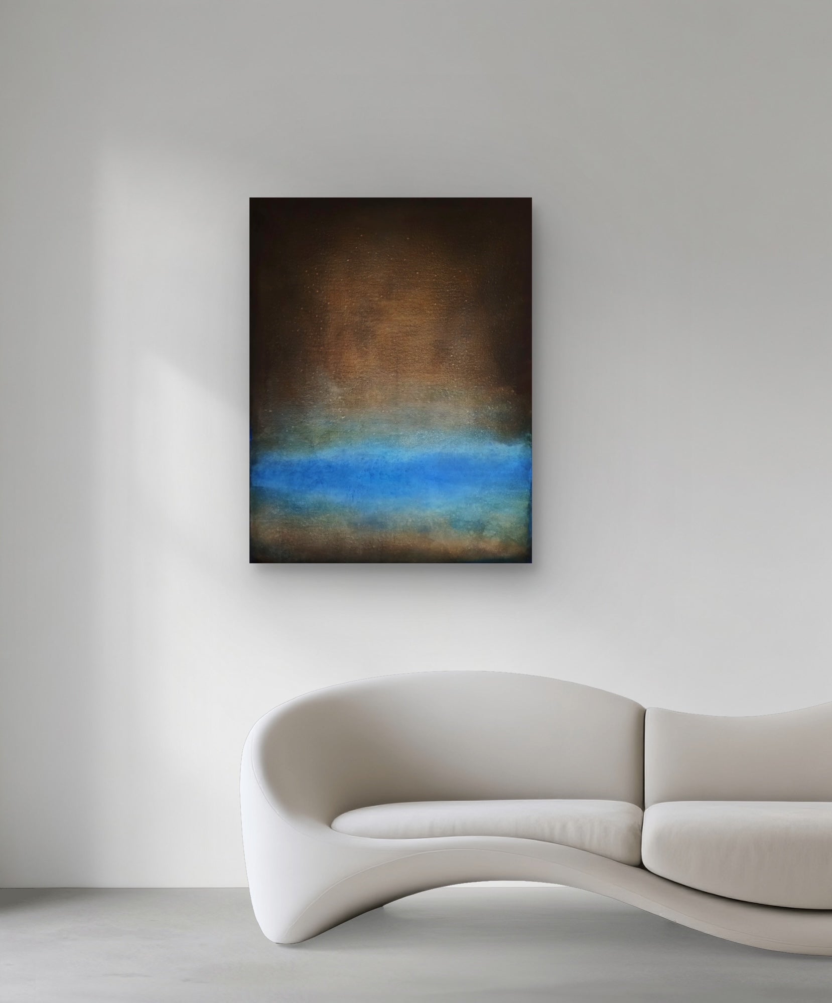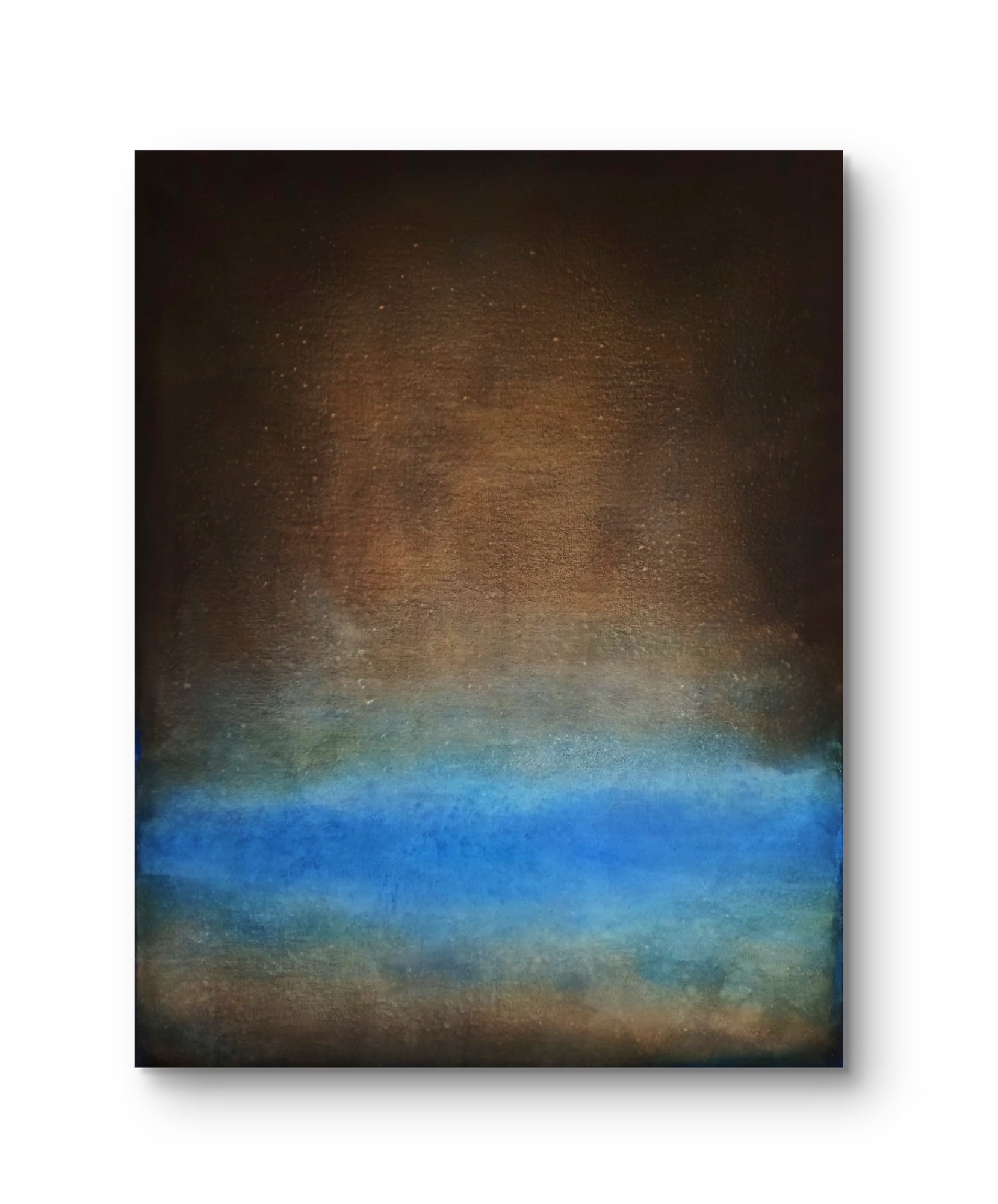 Abstract oil painting on canvas in dark tones with blue accents.