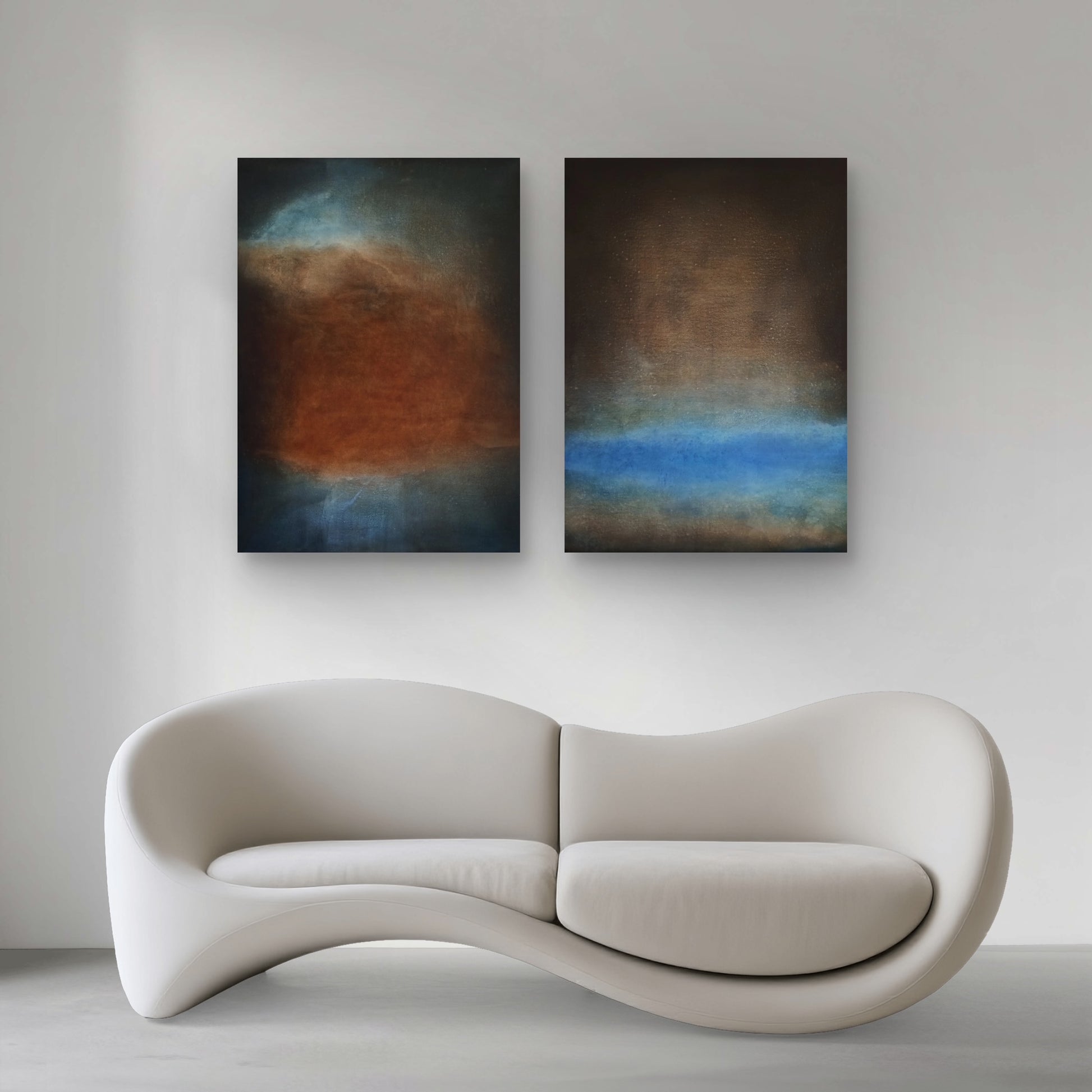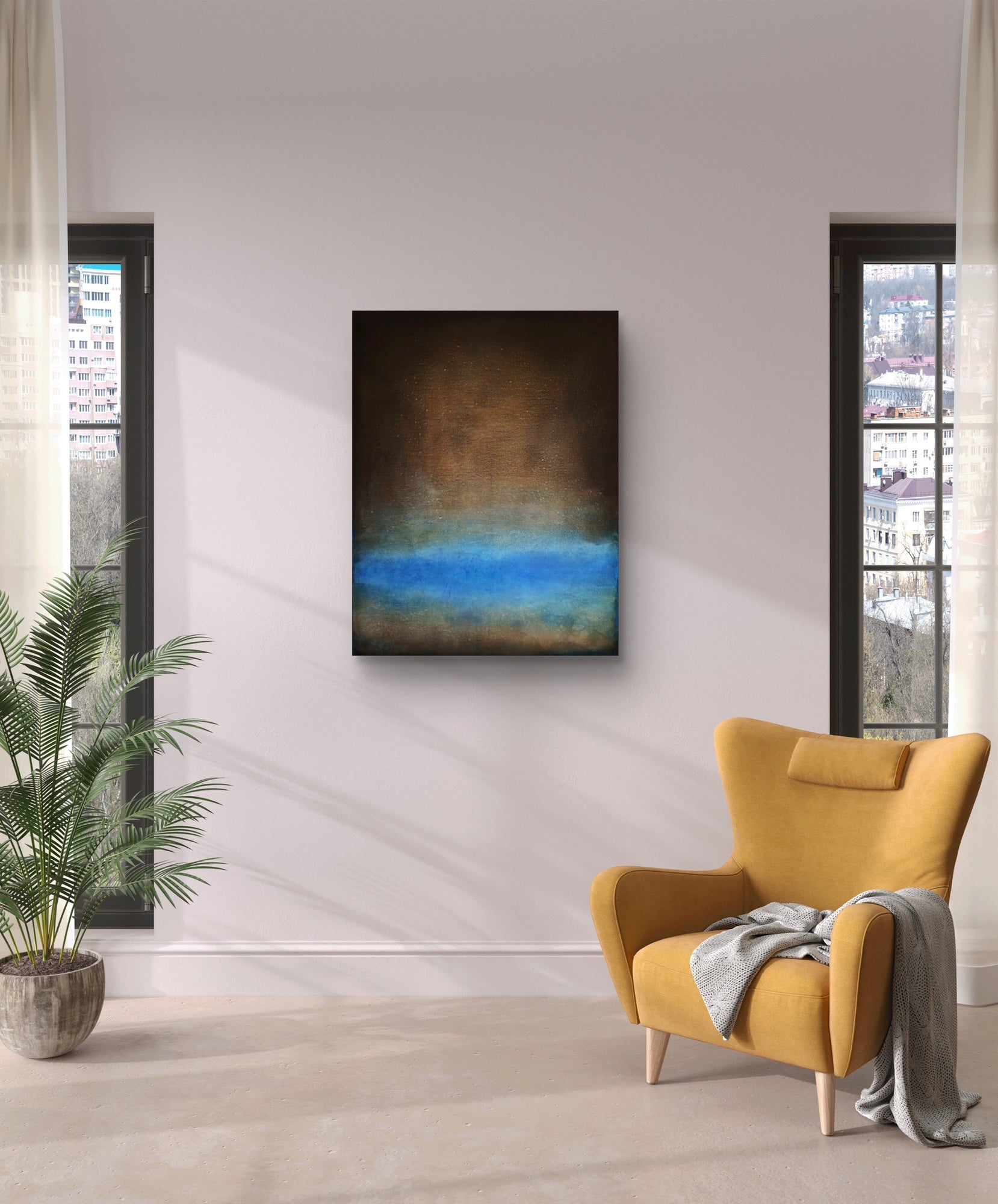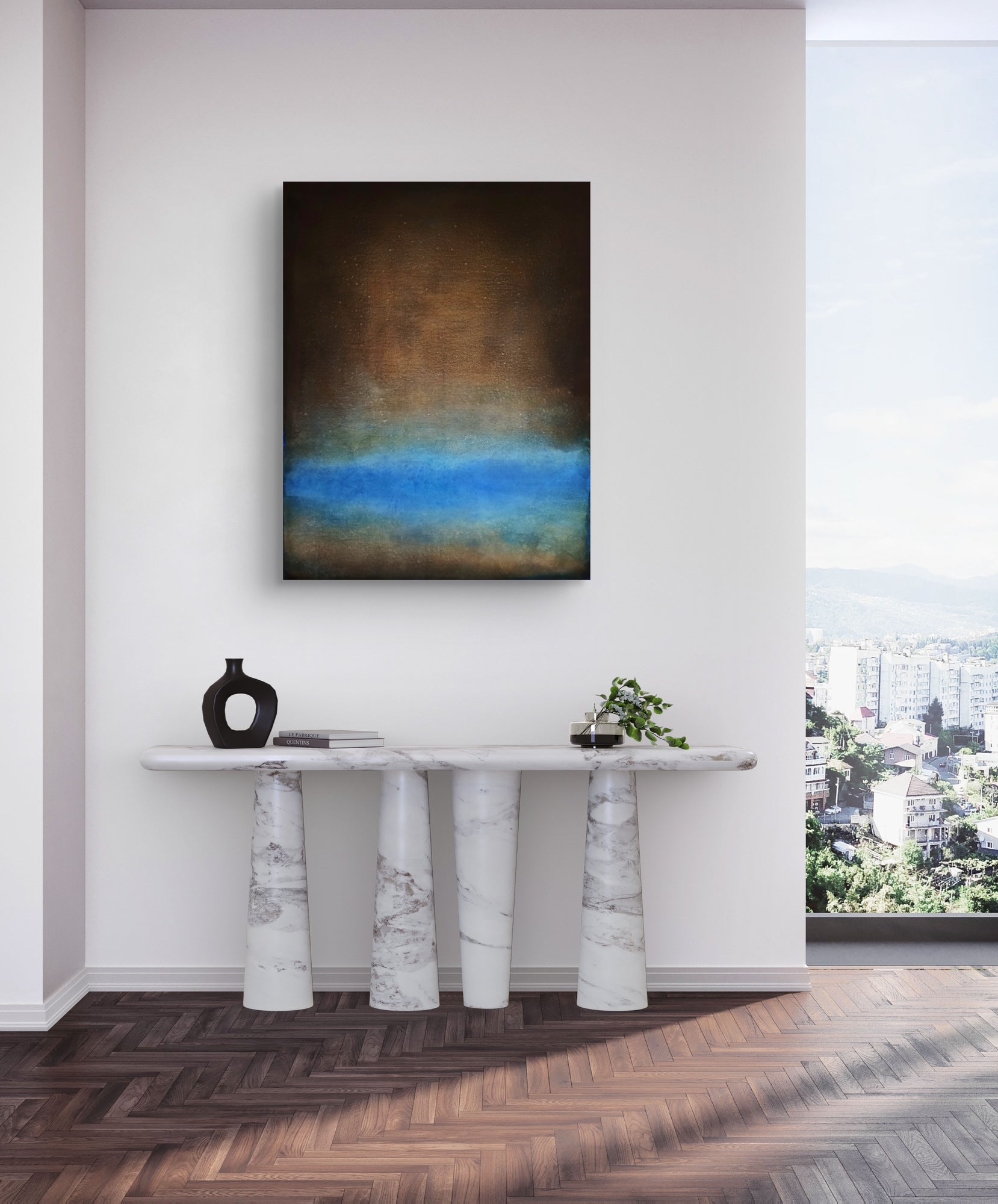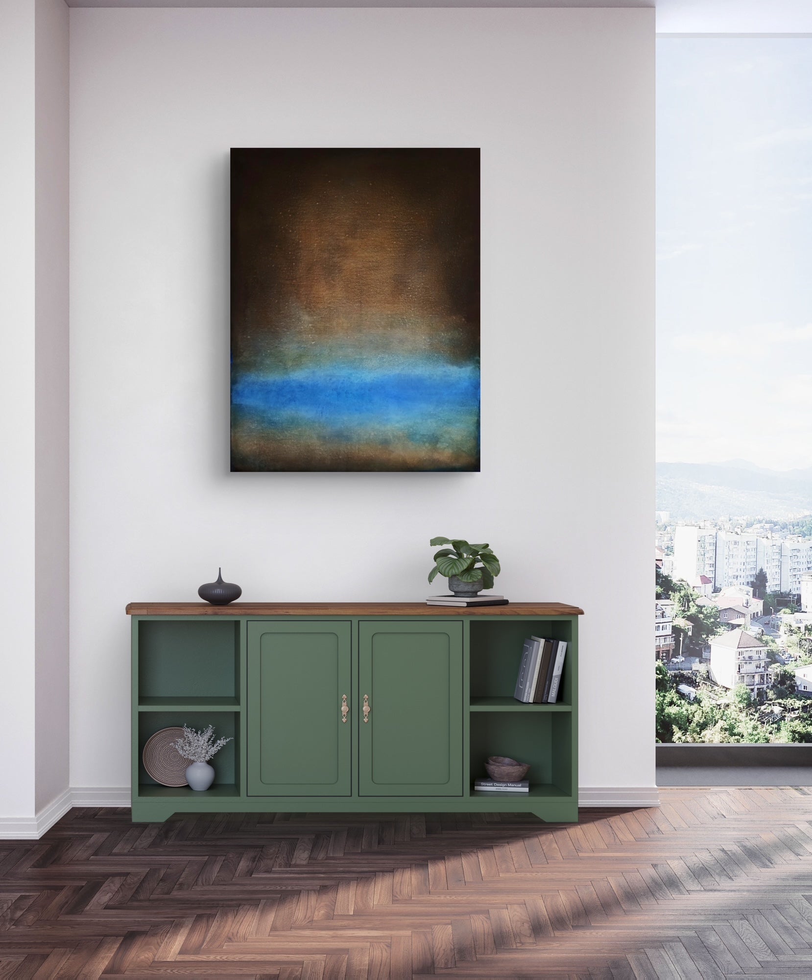 Abstract oil painting on canvas in dark tones with blue accents.