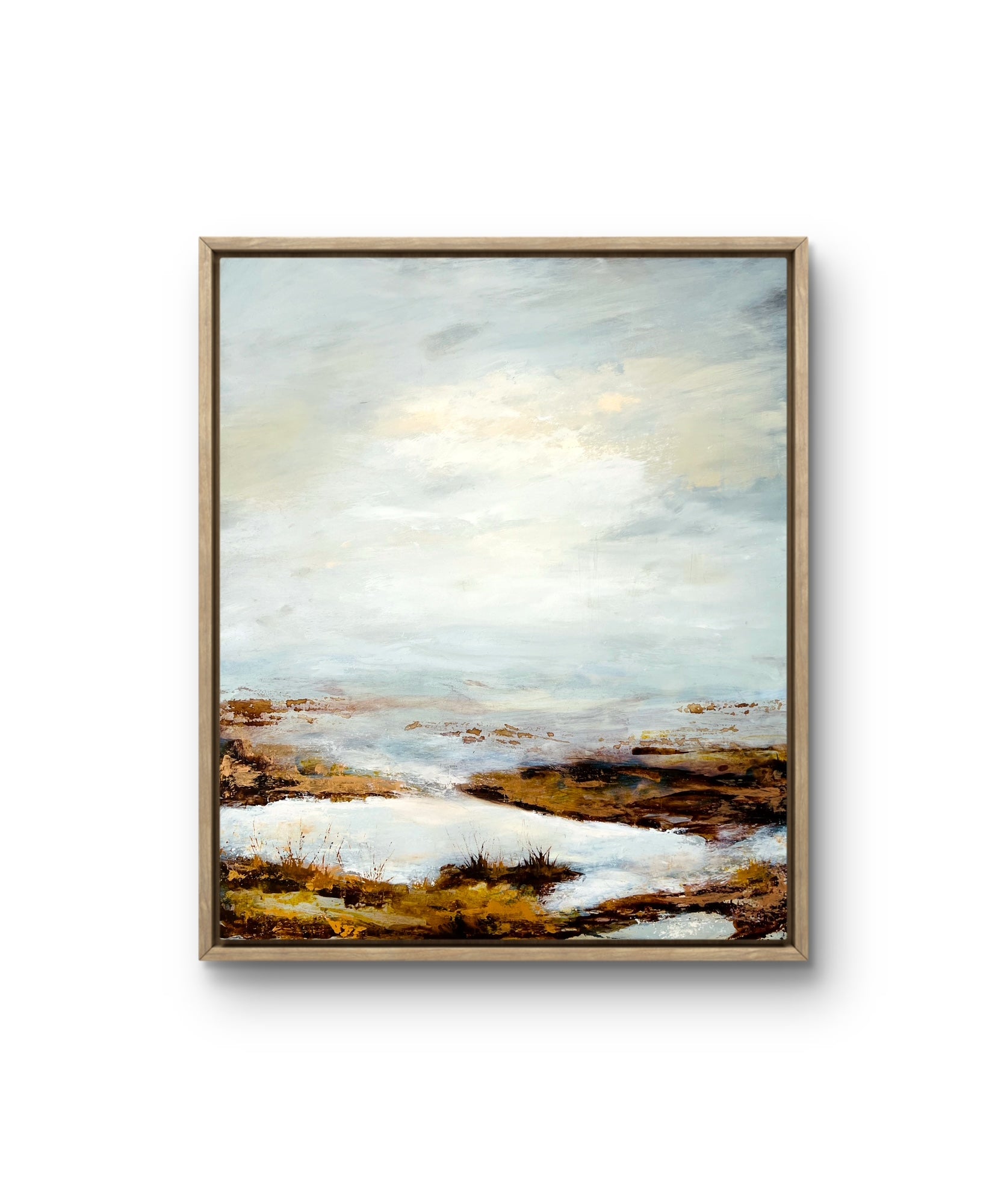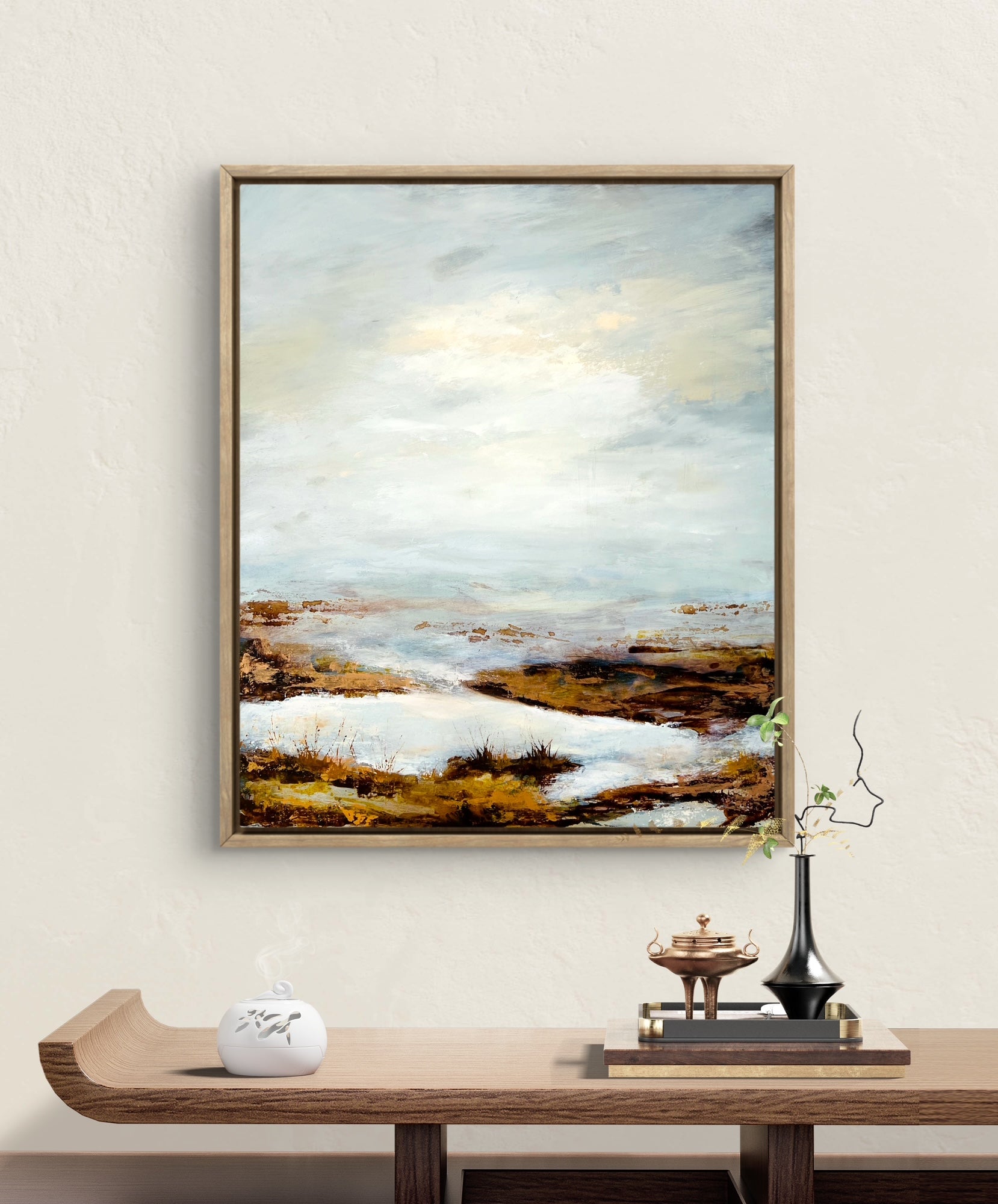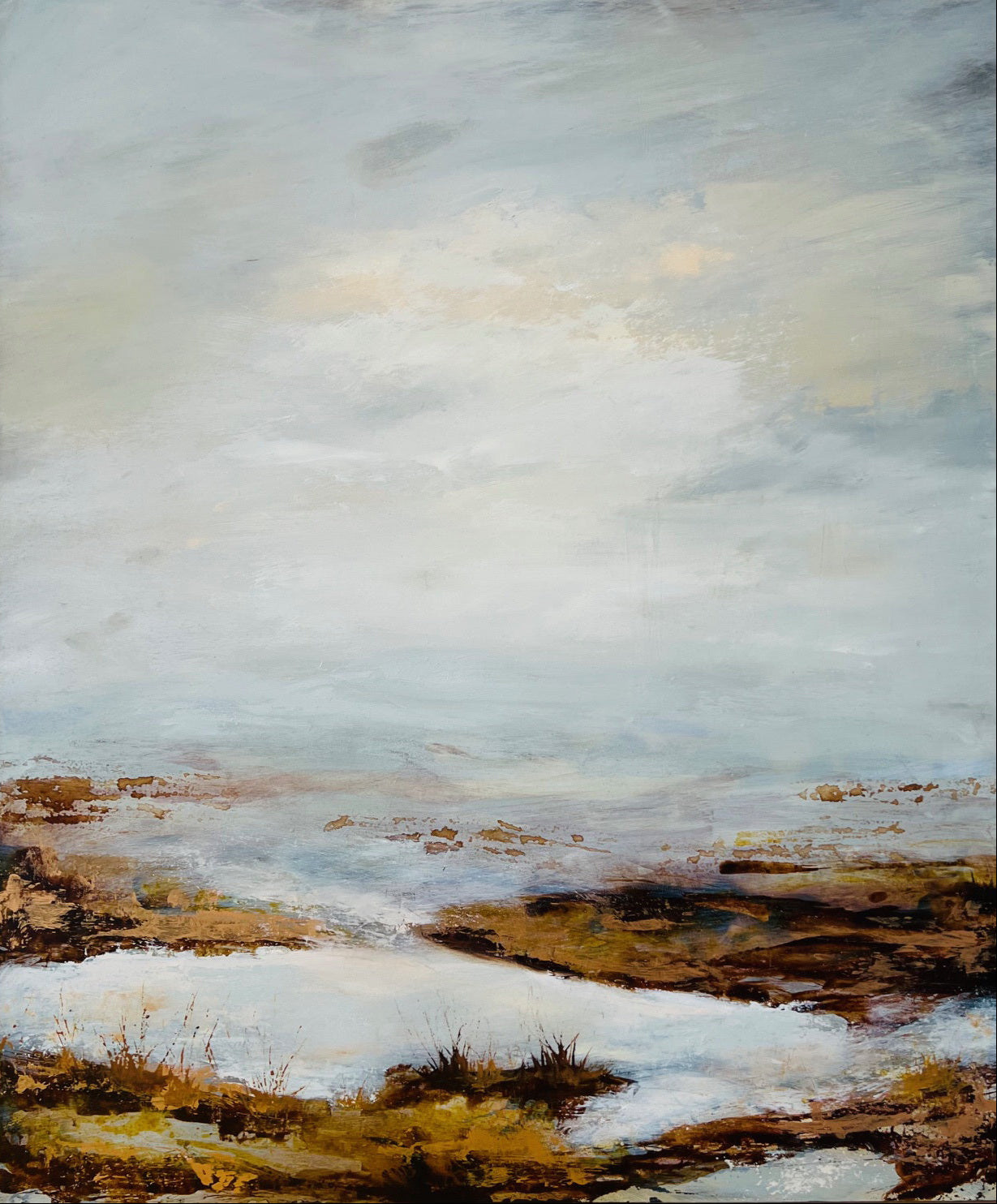 A beautiful painting of a landscape with a cloudy sky and terrain in shades of gold, brown, white and yellow.