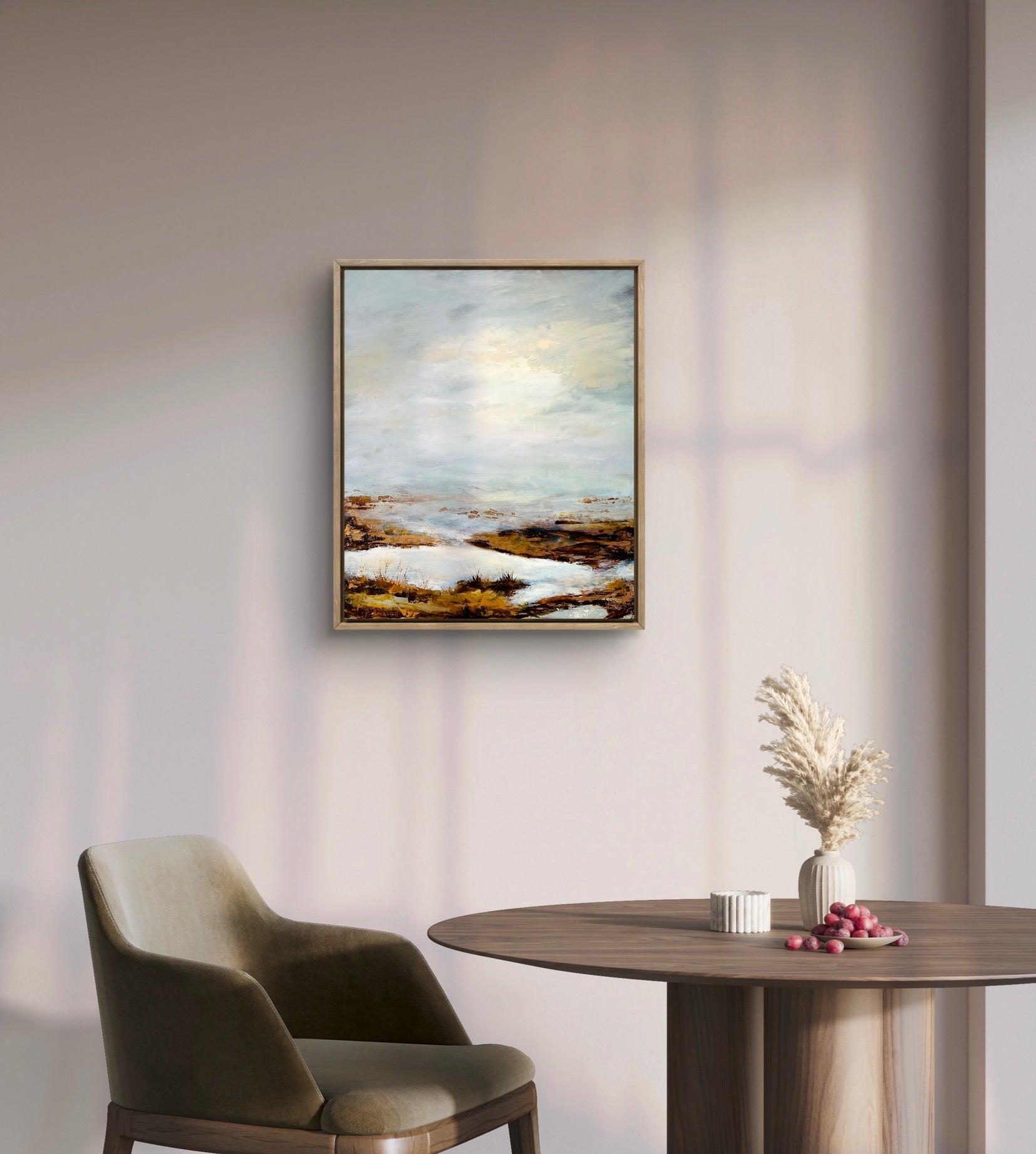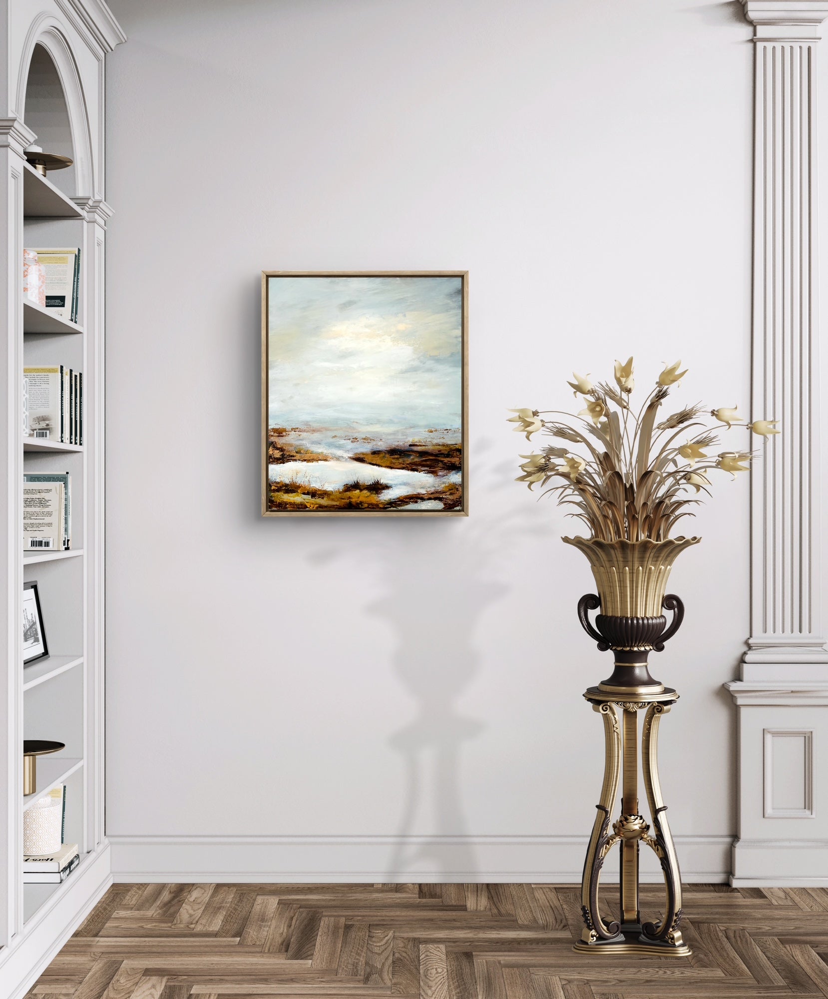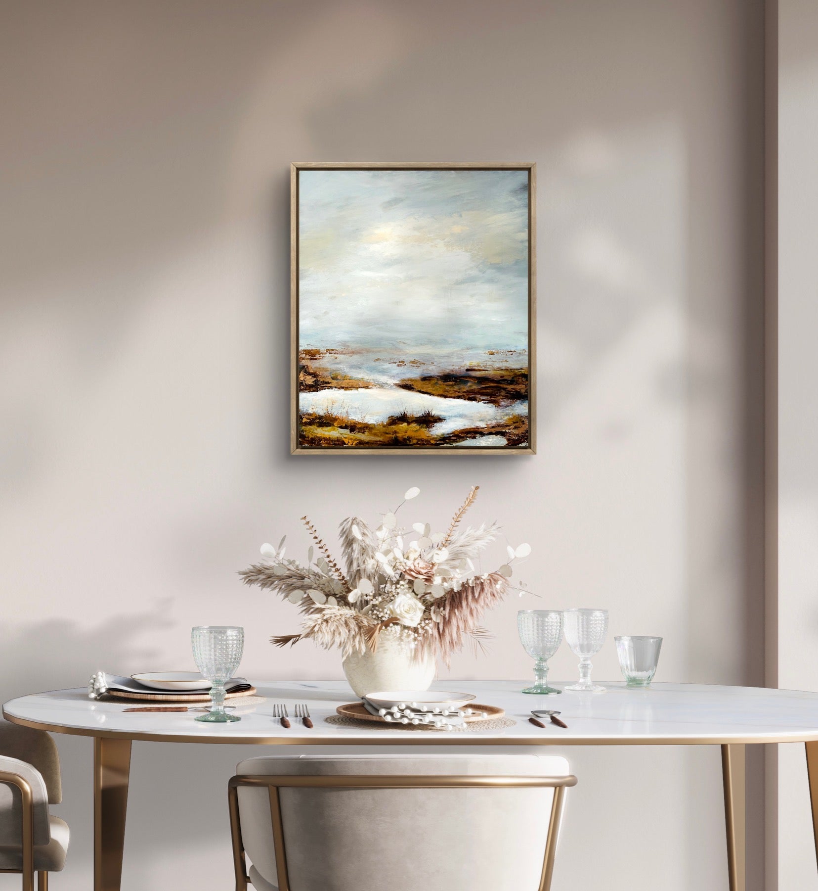A beautiful painting of a landscape with a cloudy sky and terrain in shades of gold, brown, white and yellow.
