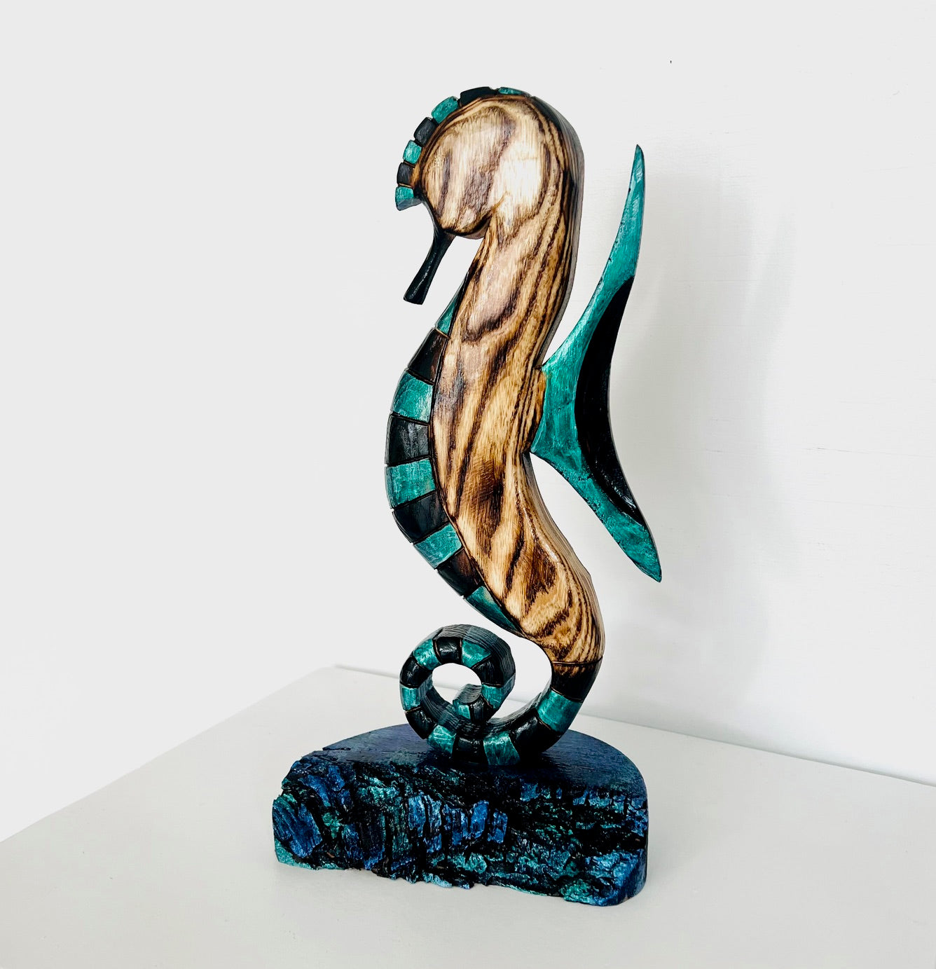 Medium: Wood sculpture, hand painted iridescent acrylic paint design