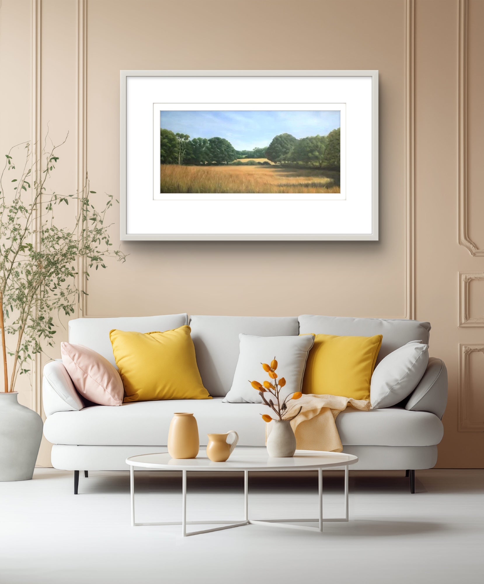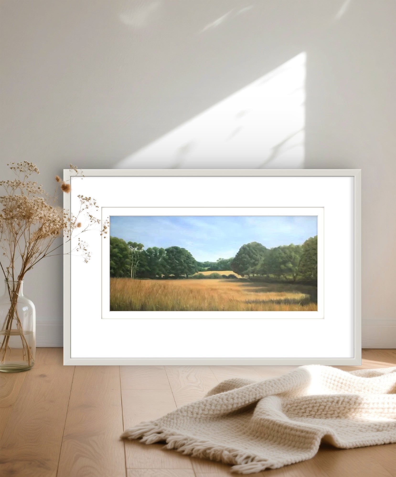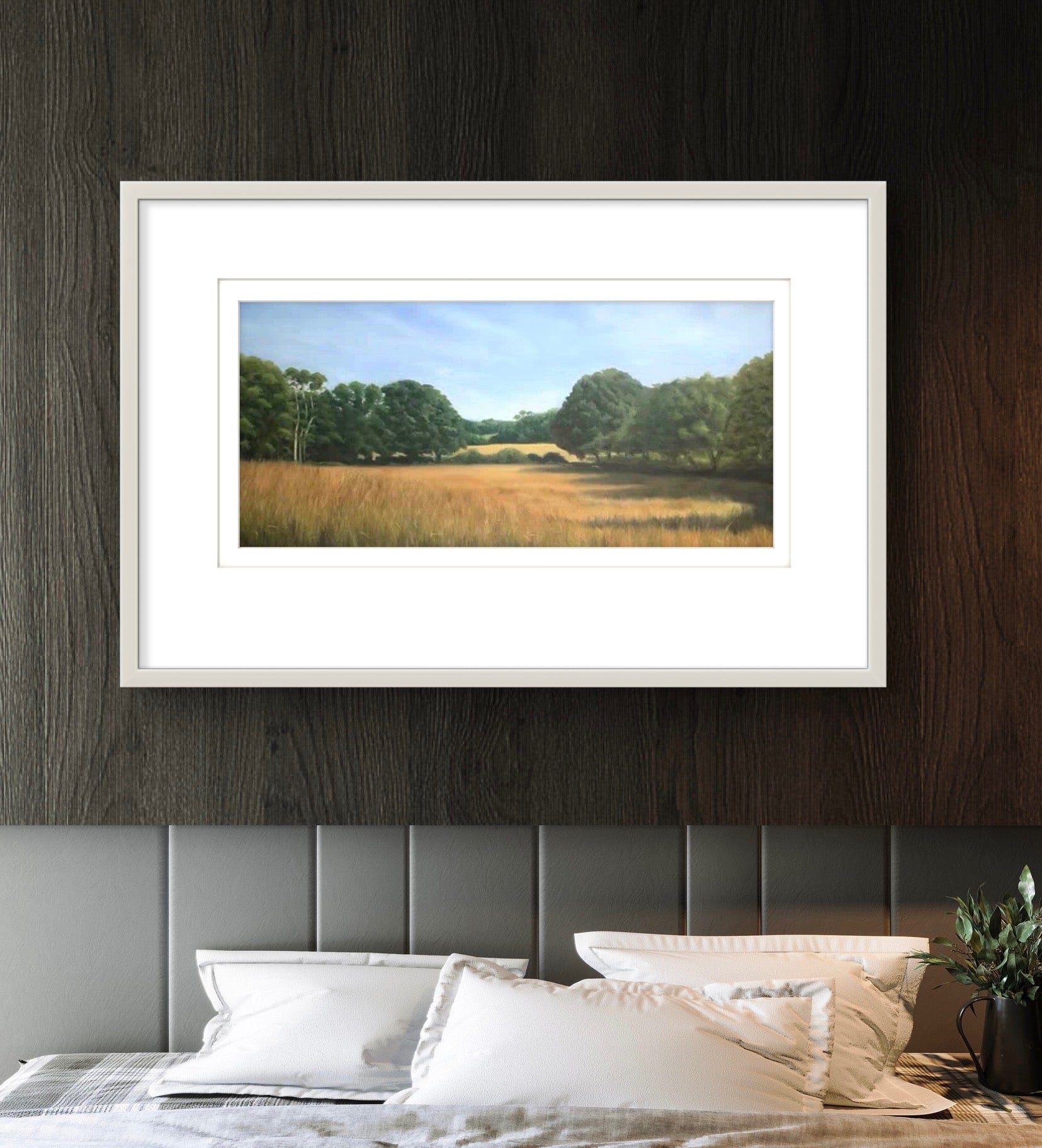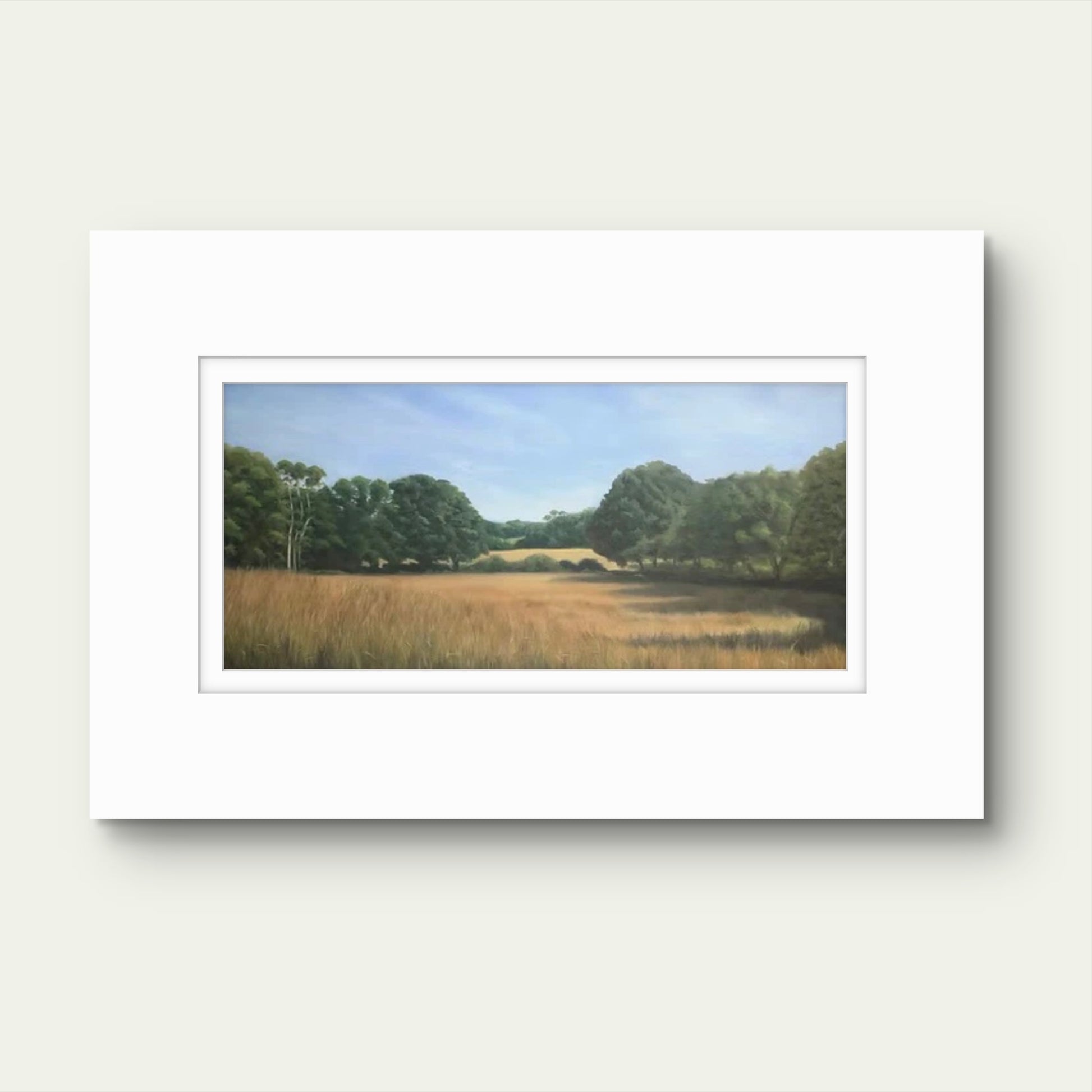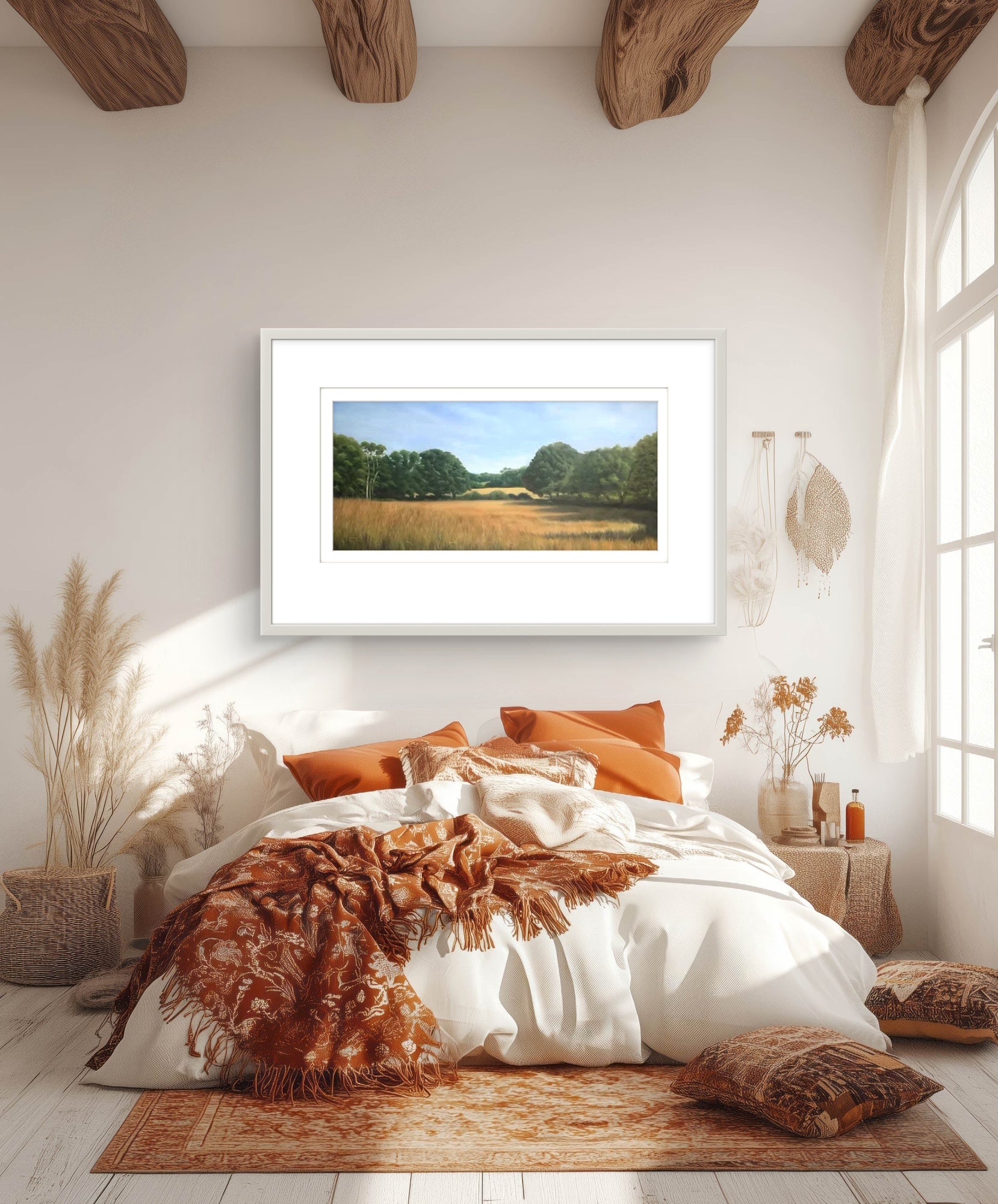 Landscape with a field of tall, brown grass and trees in the distance, under a clear blue sky