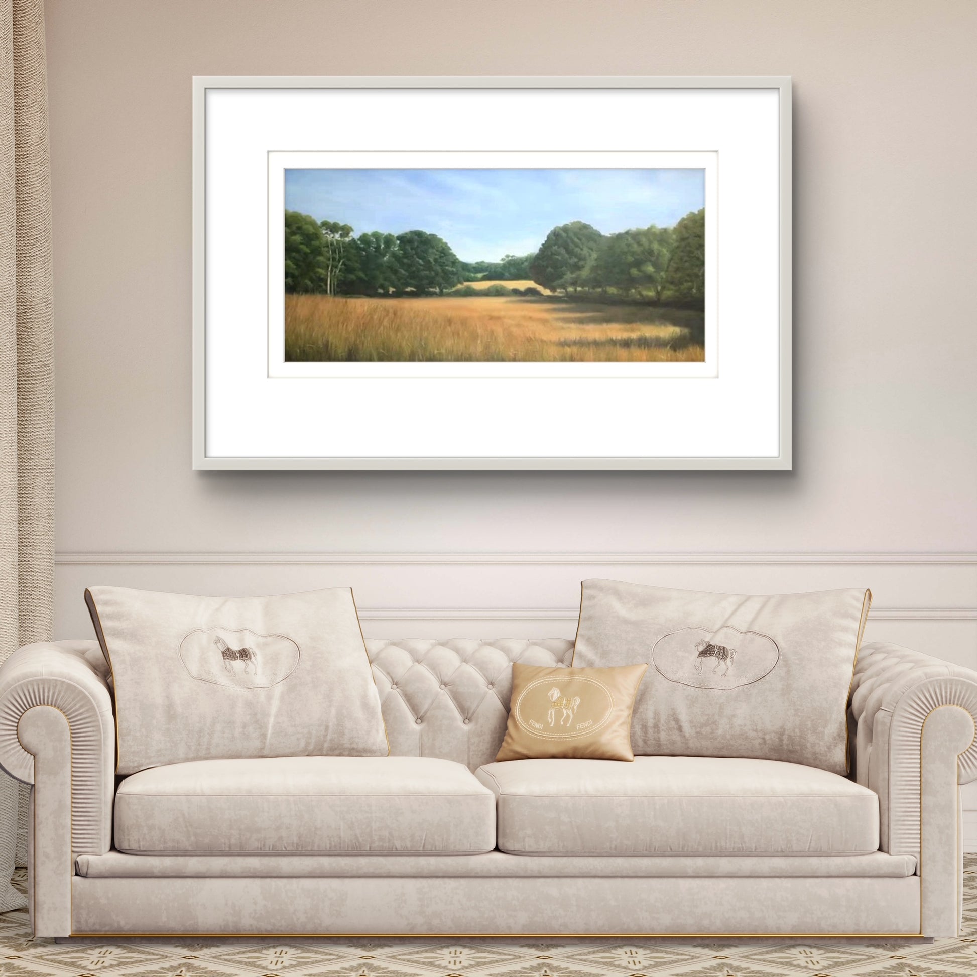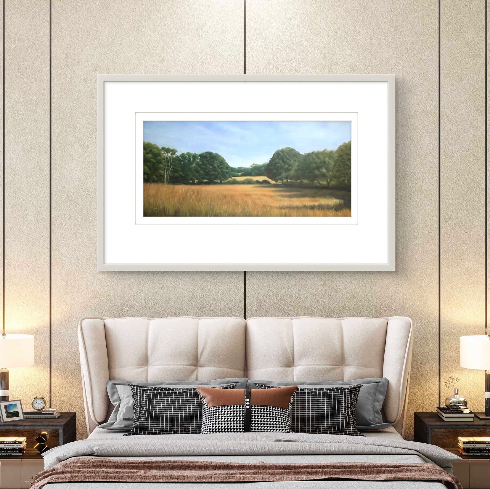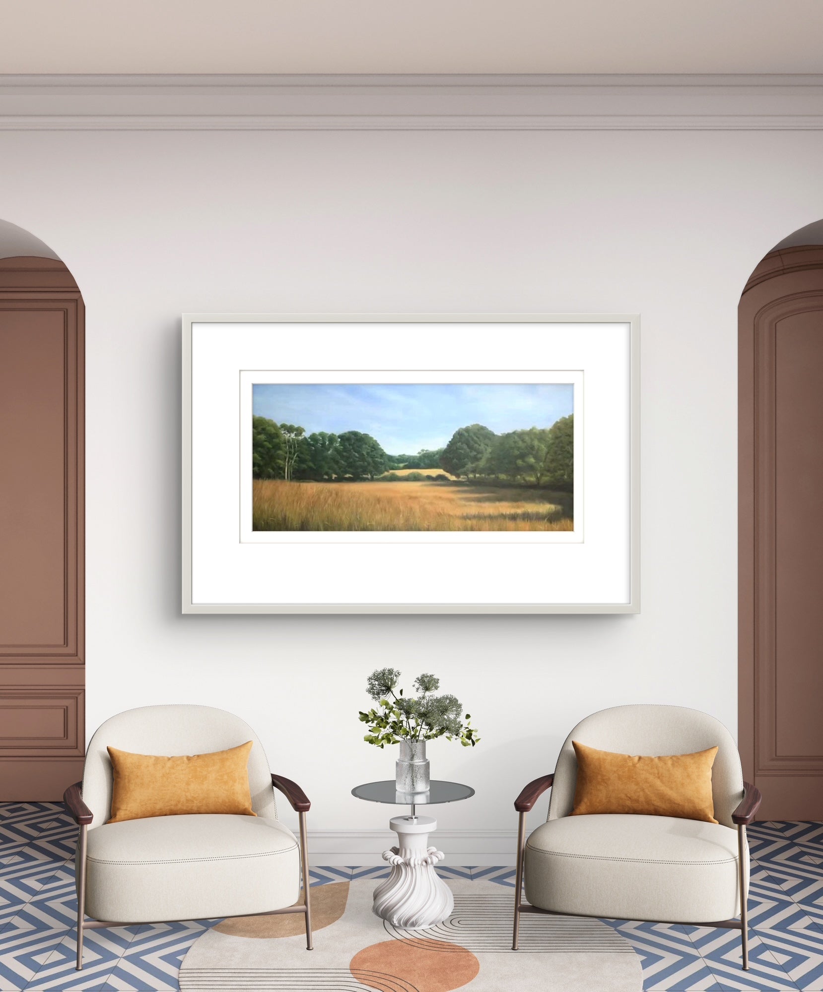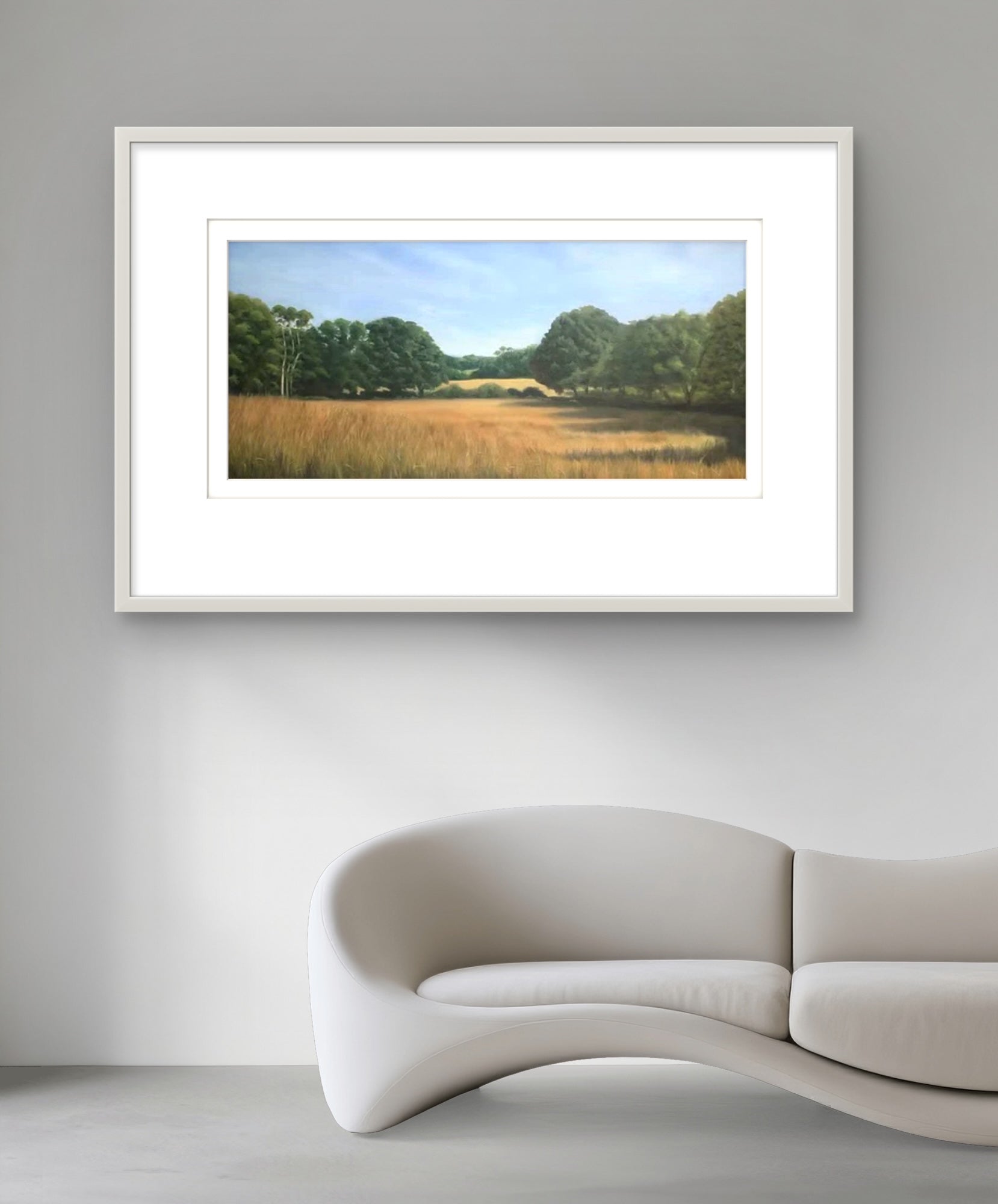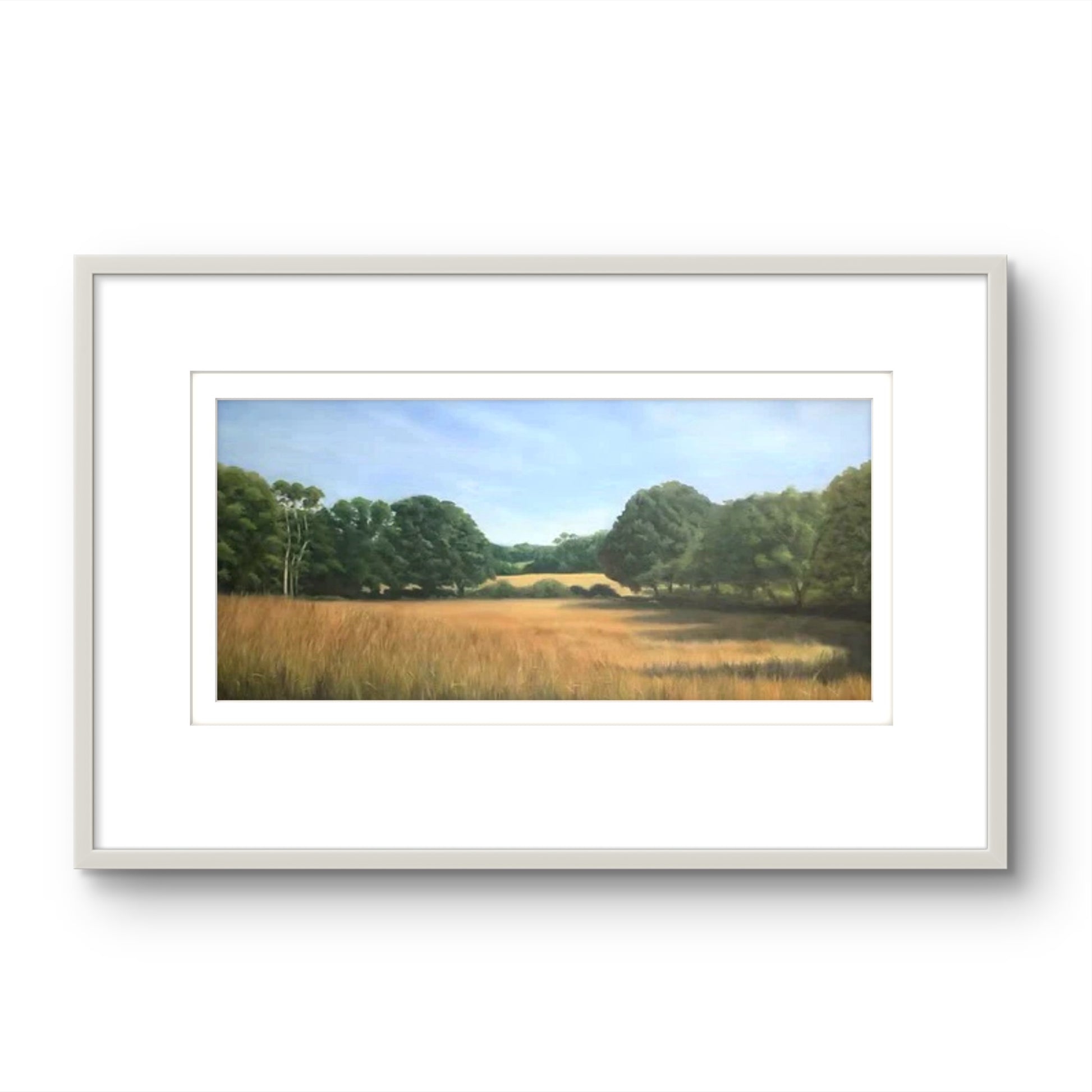 Landscape with a field of tall, brown grass and trees in the distance, under a clear blue sky