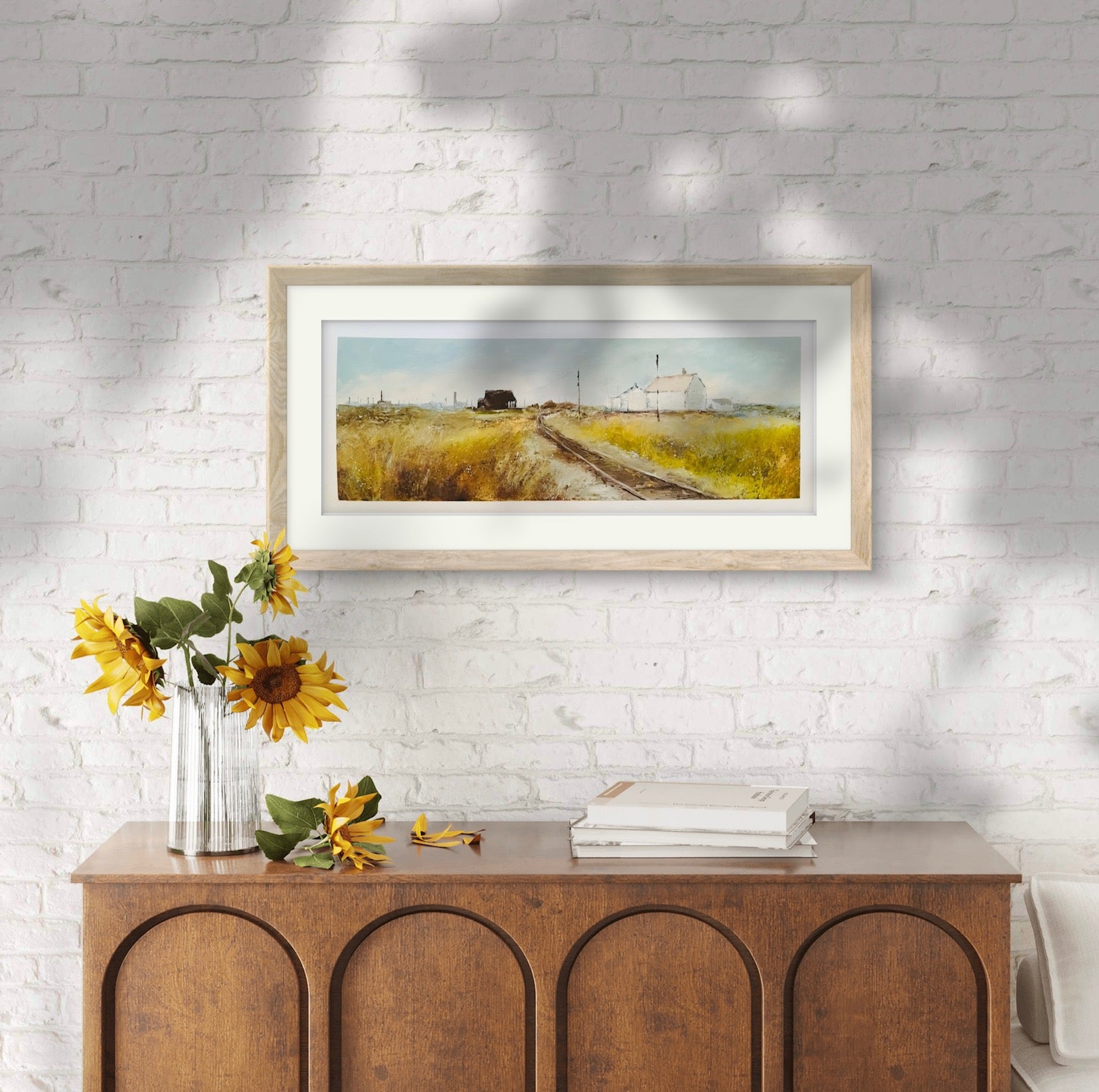 Framed in a natural wood frame with glass
