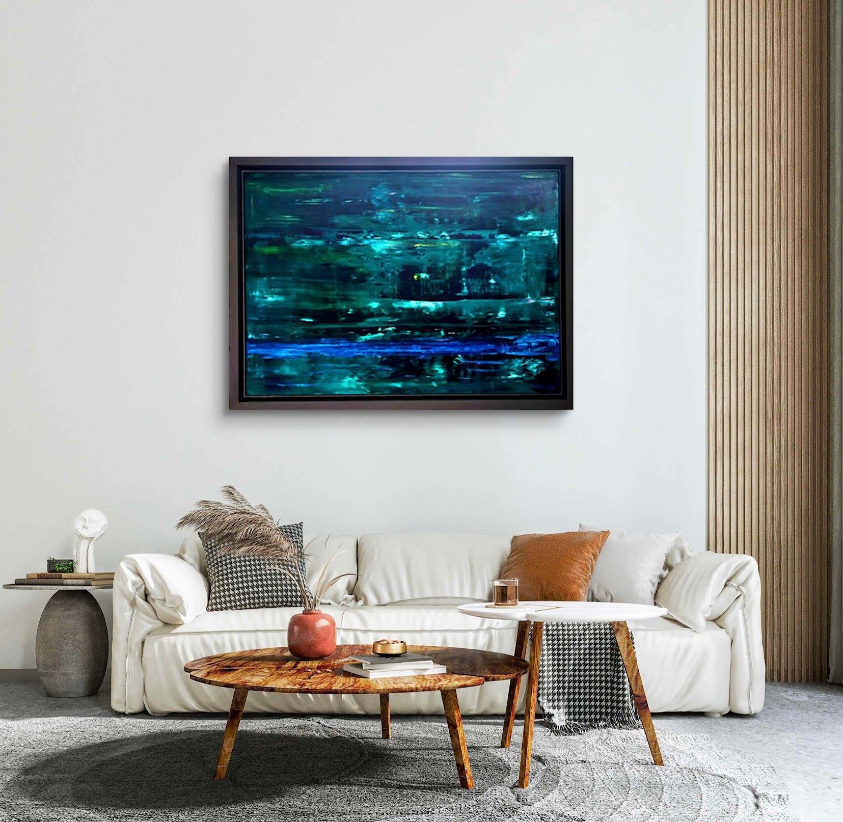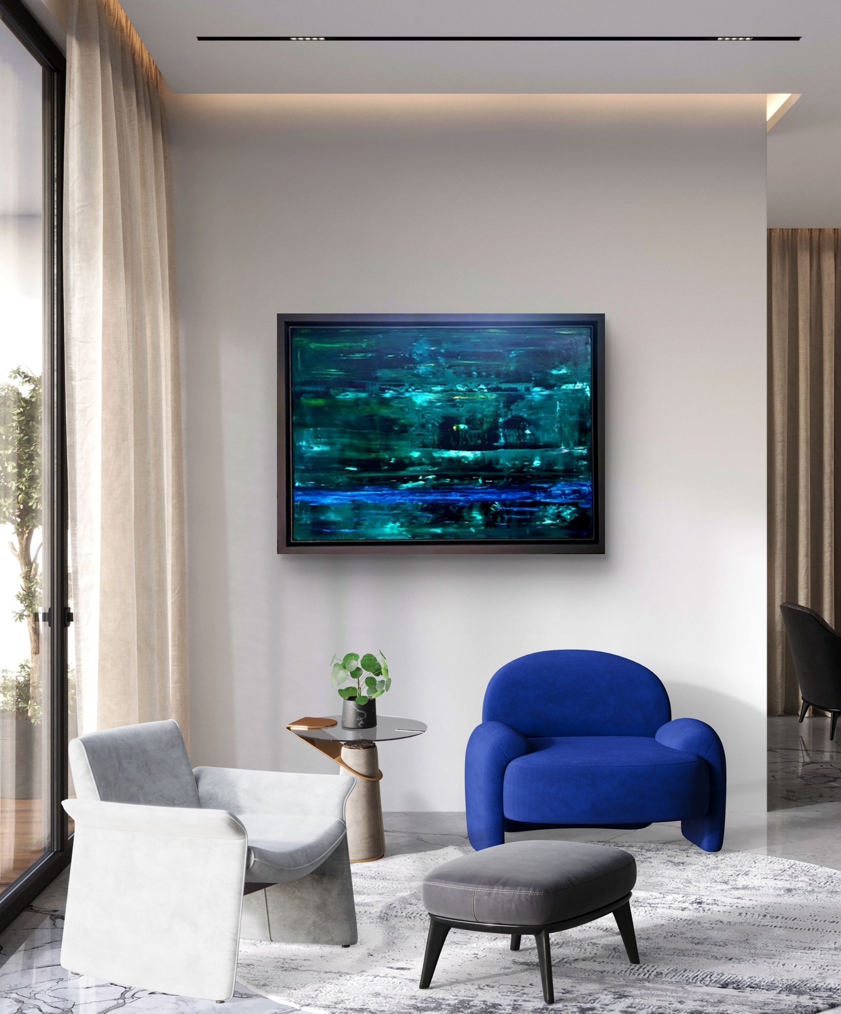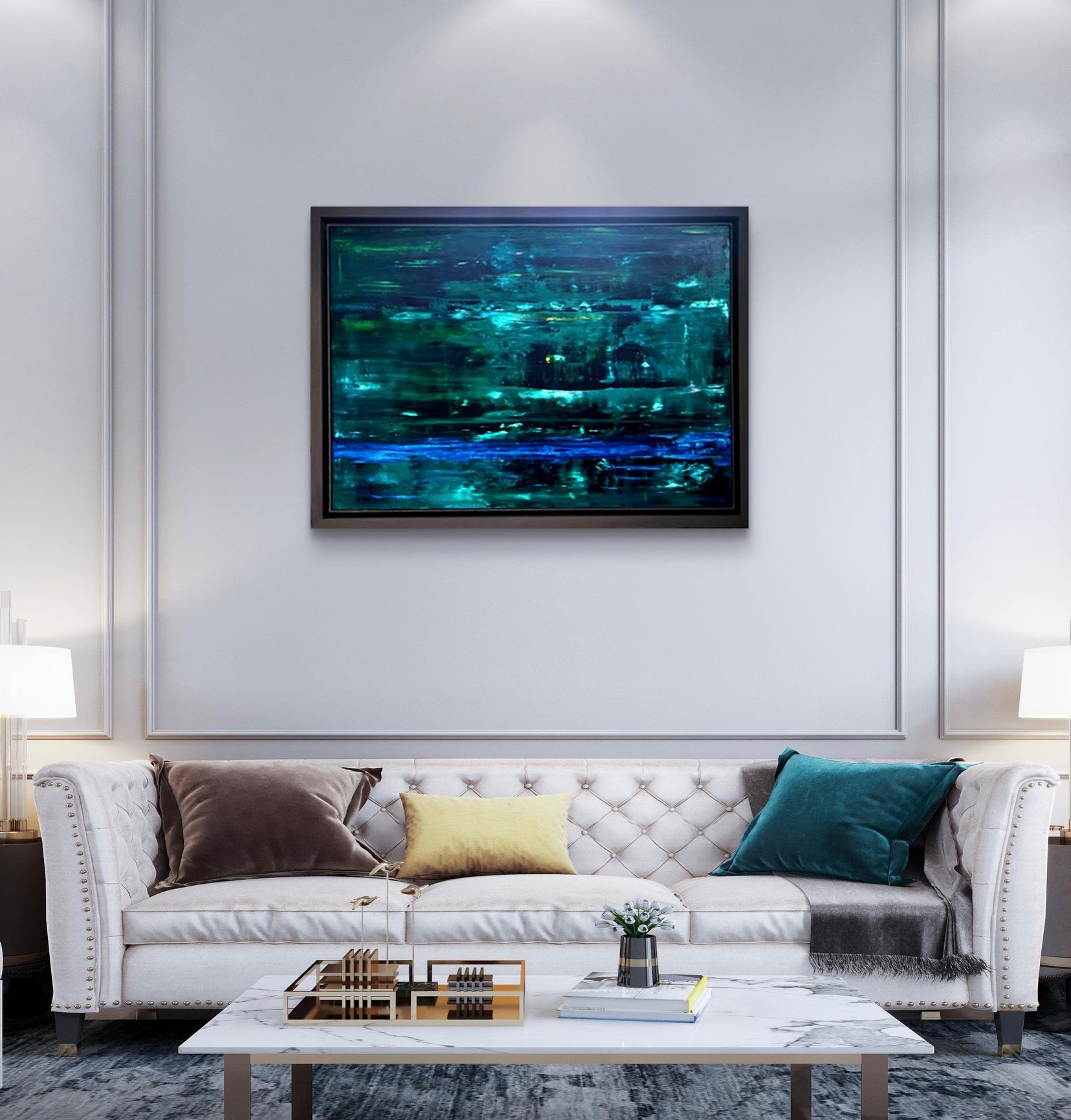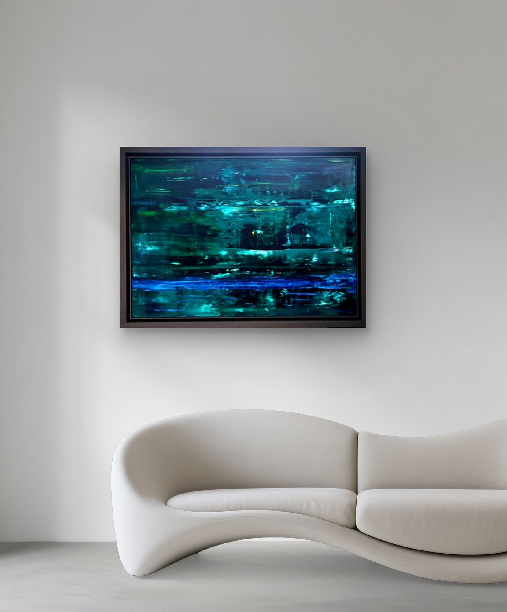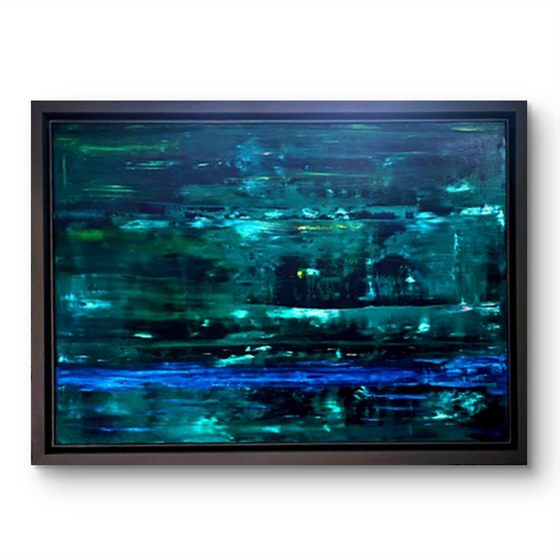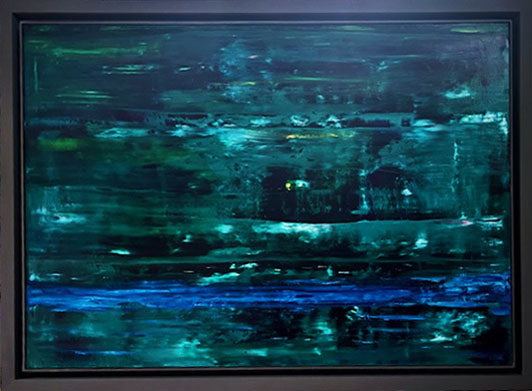 An abstract oil painting in shades of dark and light green with accents of blue, framed in a graphite frame.
