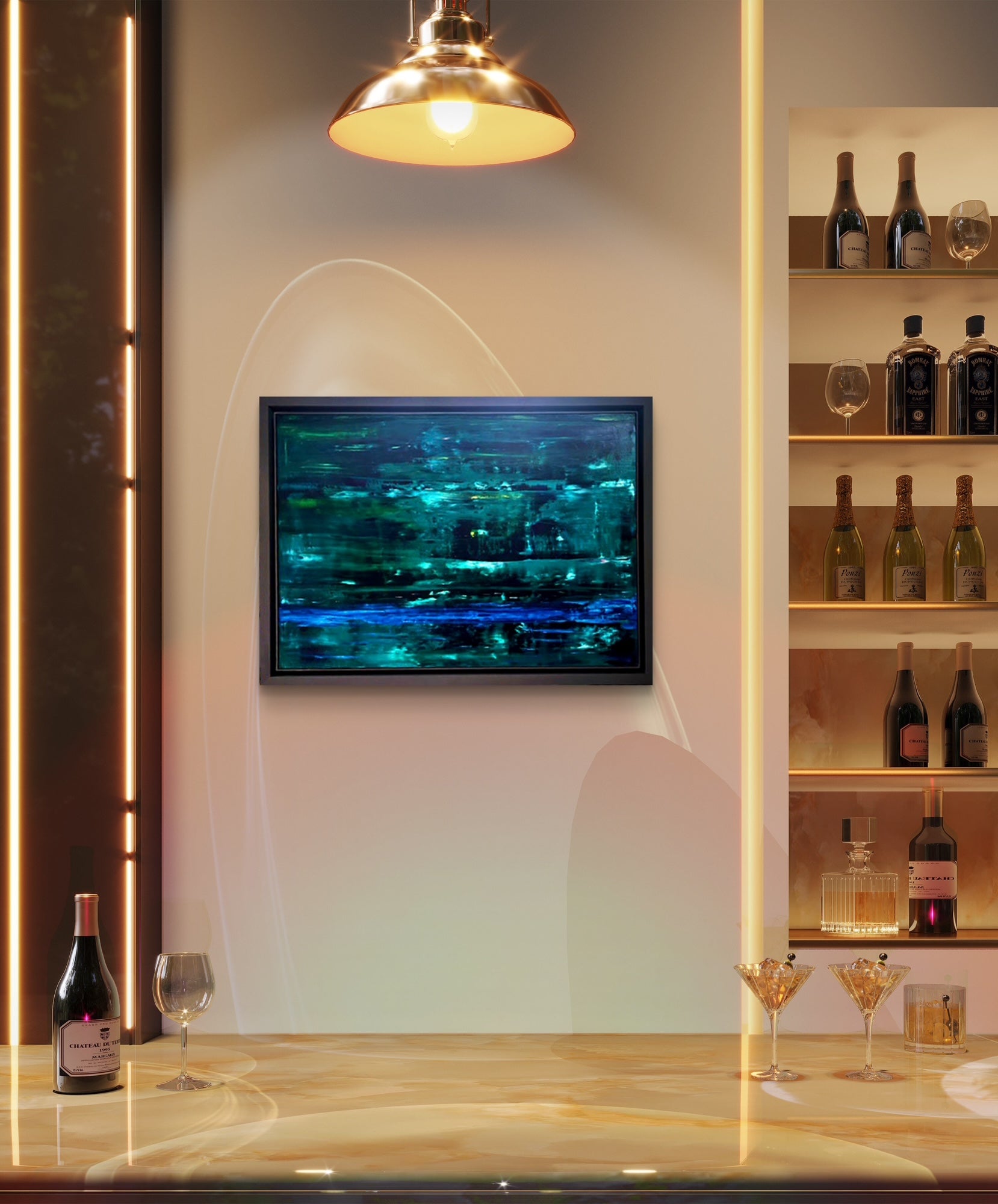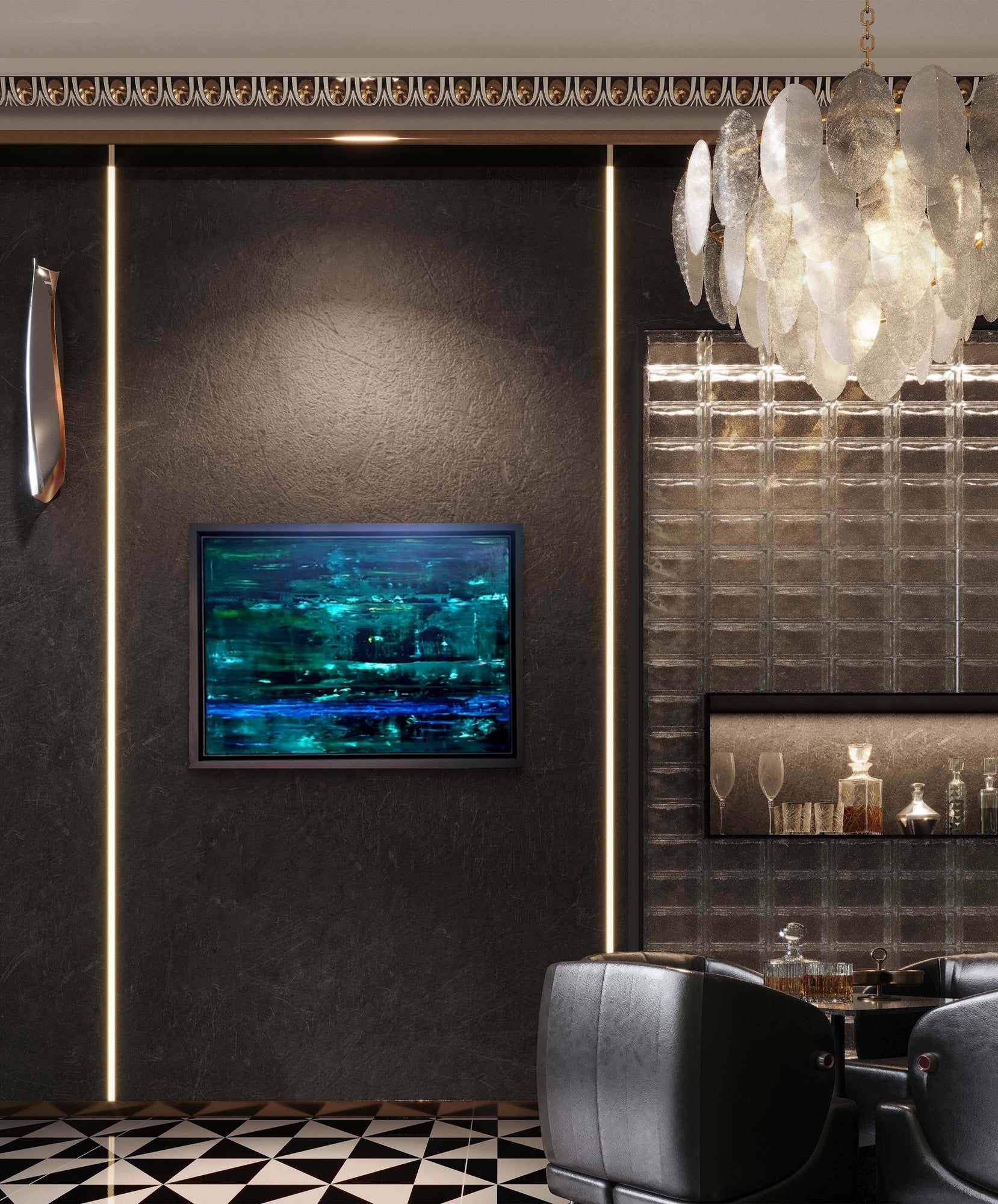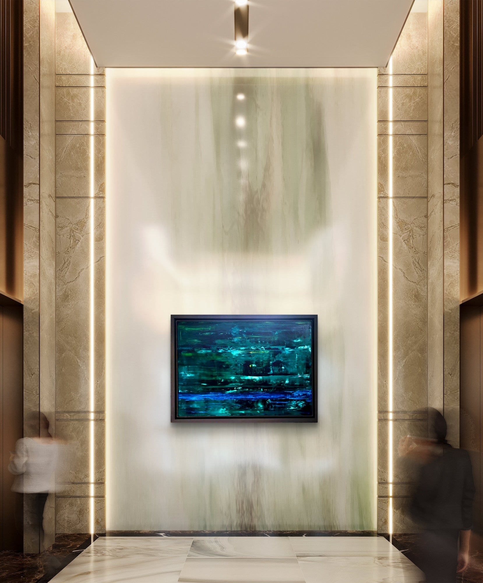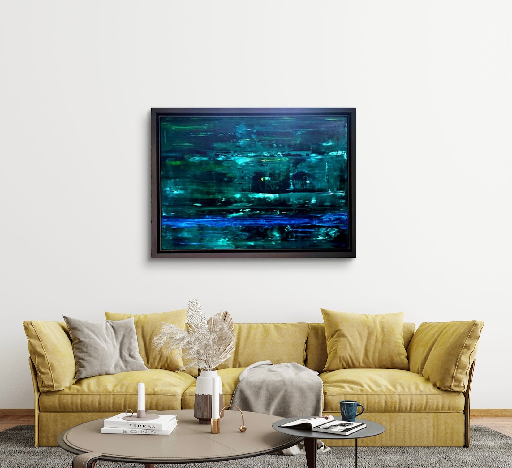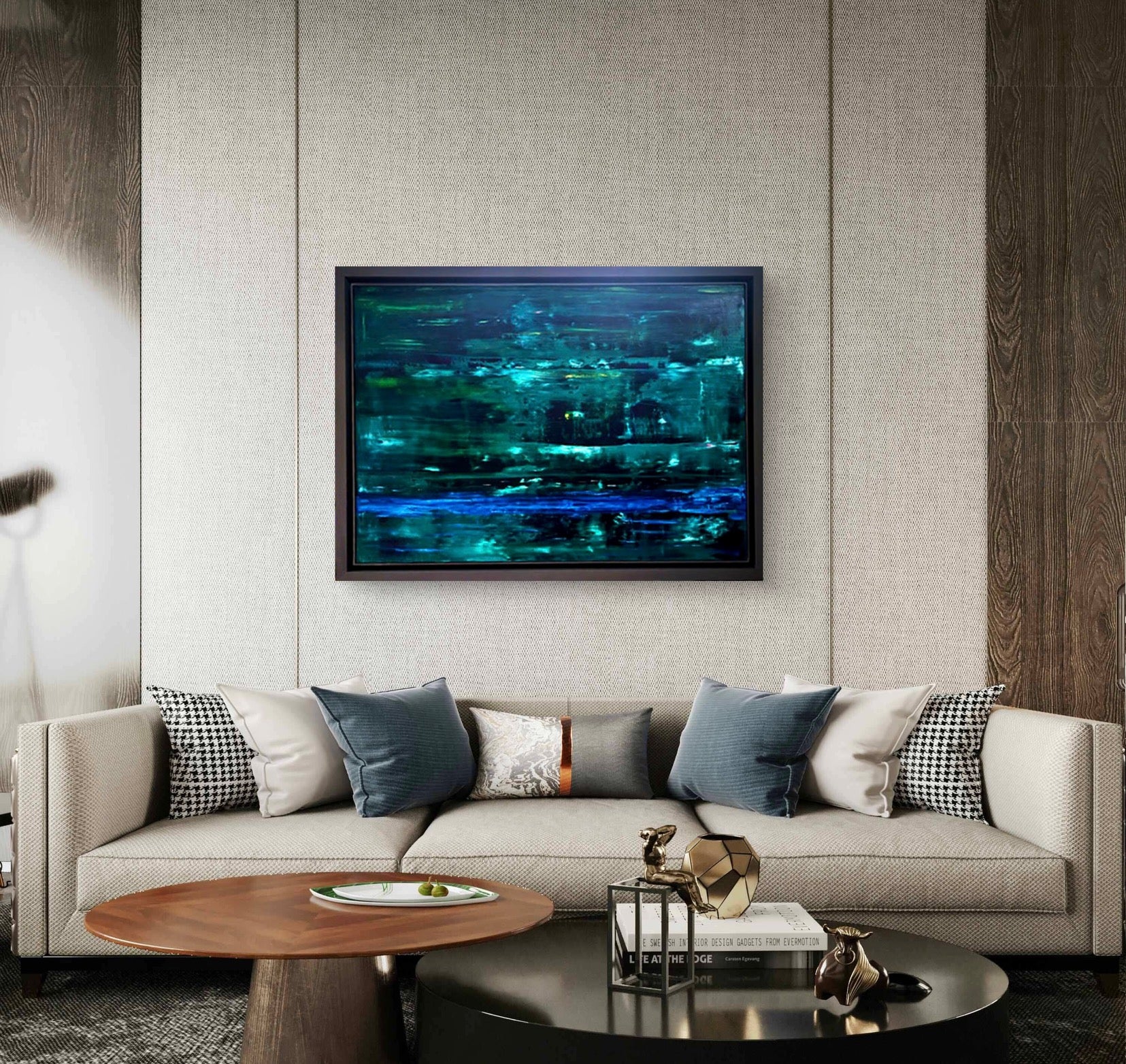 An abstract oil painting in shades of dark and light green with accents of blue, framed in a graphite frame.