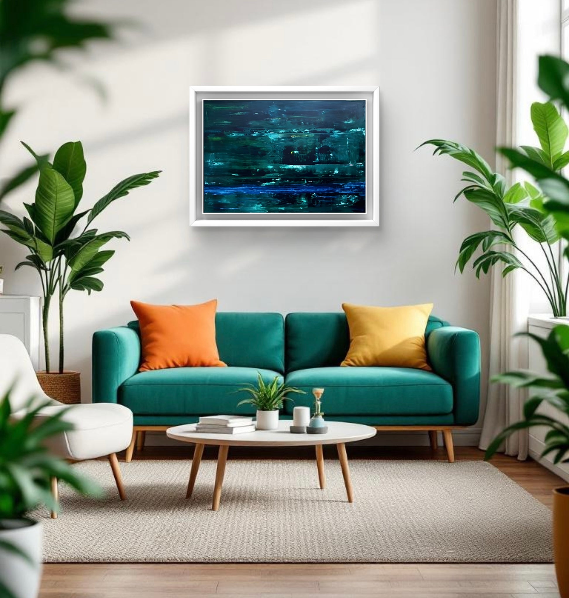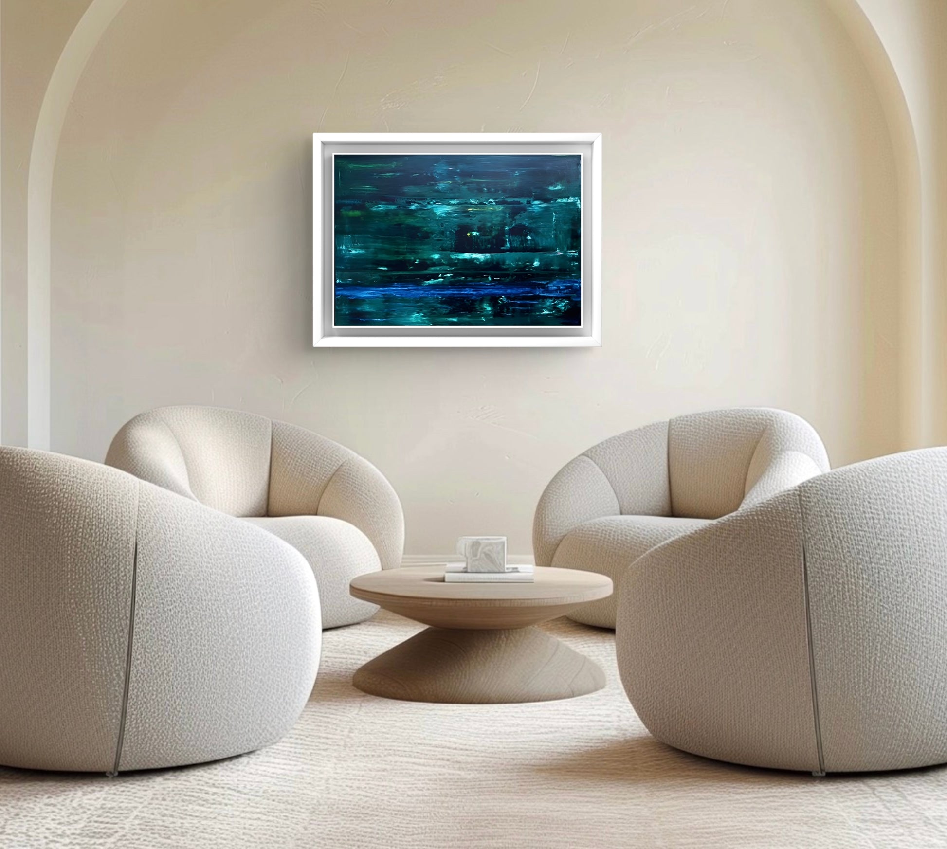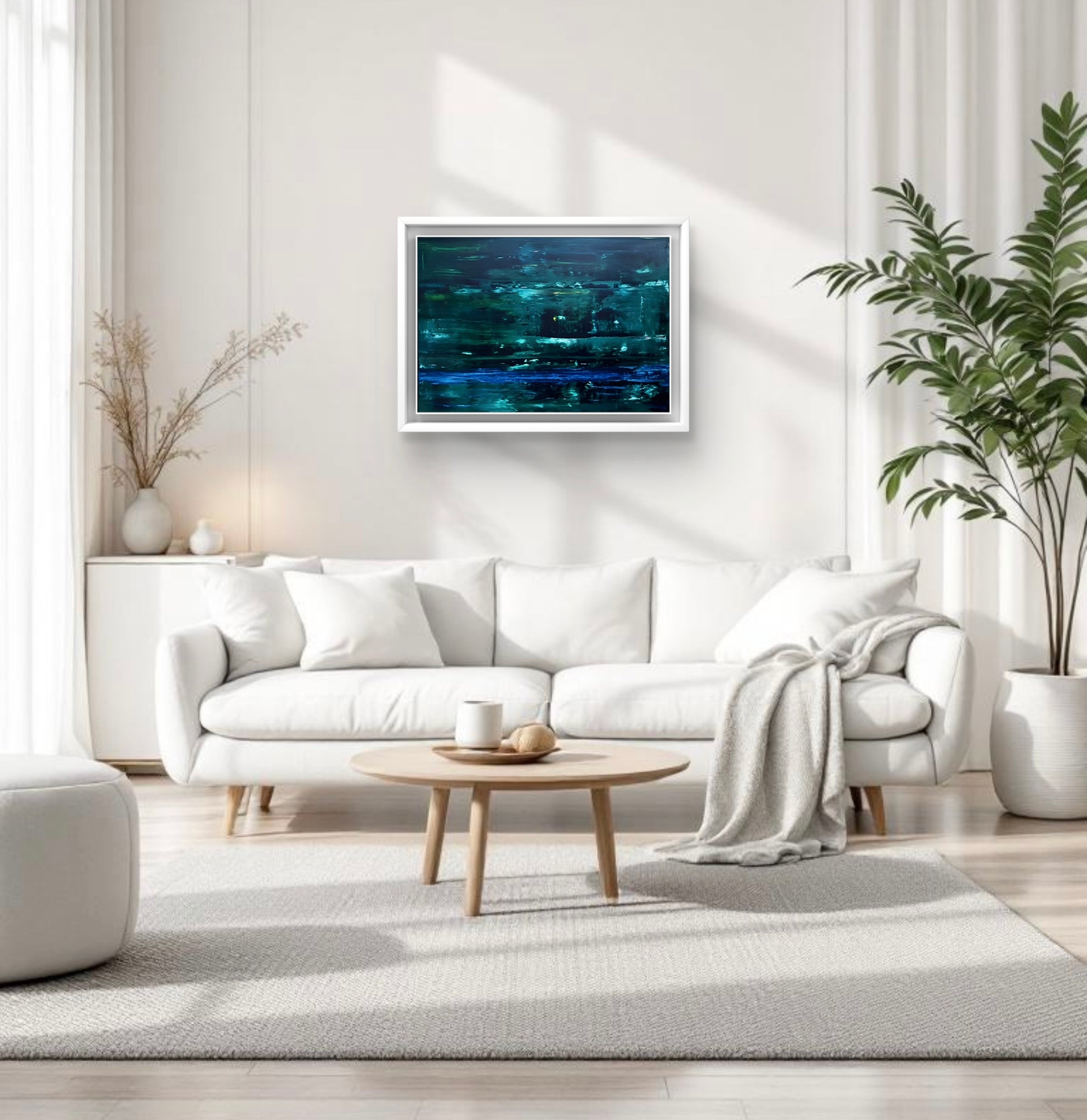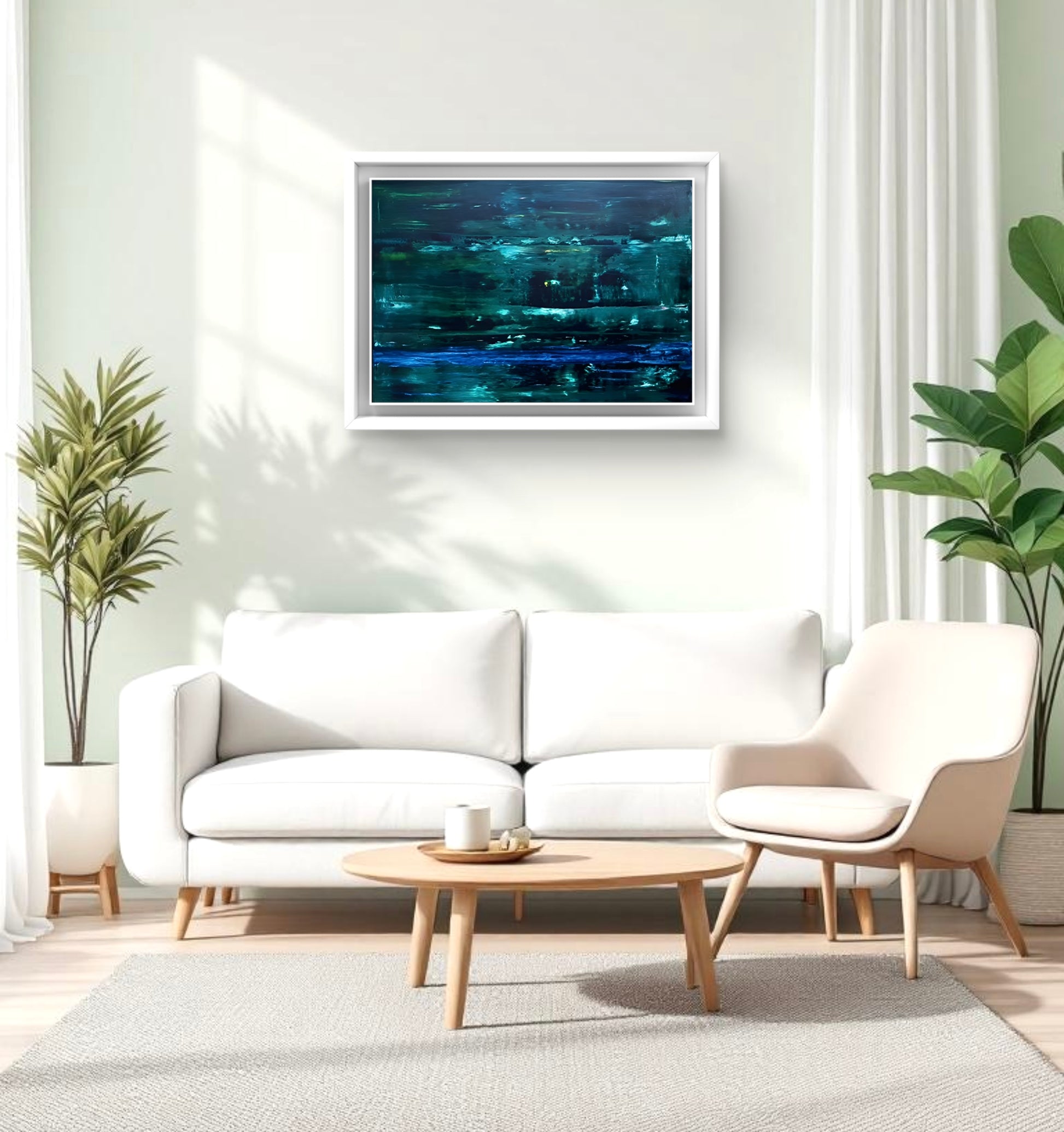 An abstract oil painting in shades of dark and light green with accents of blue, framed in a white solid wooden frame.