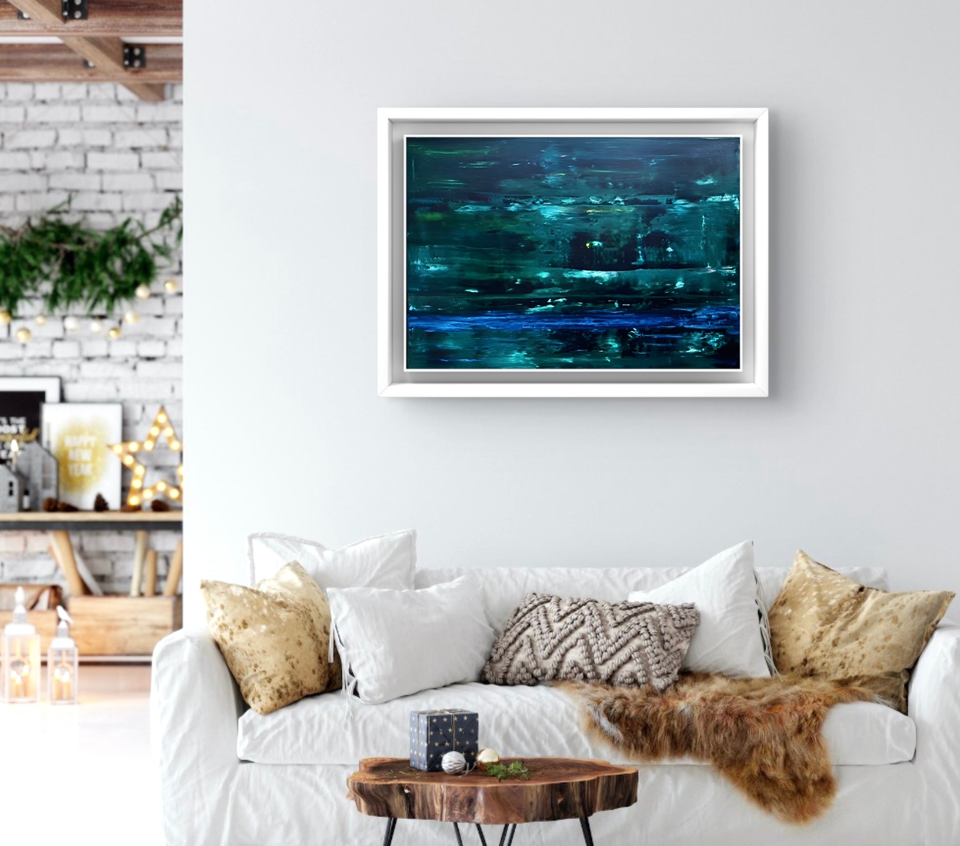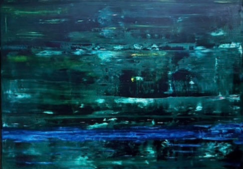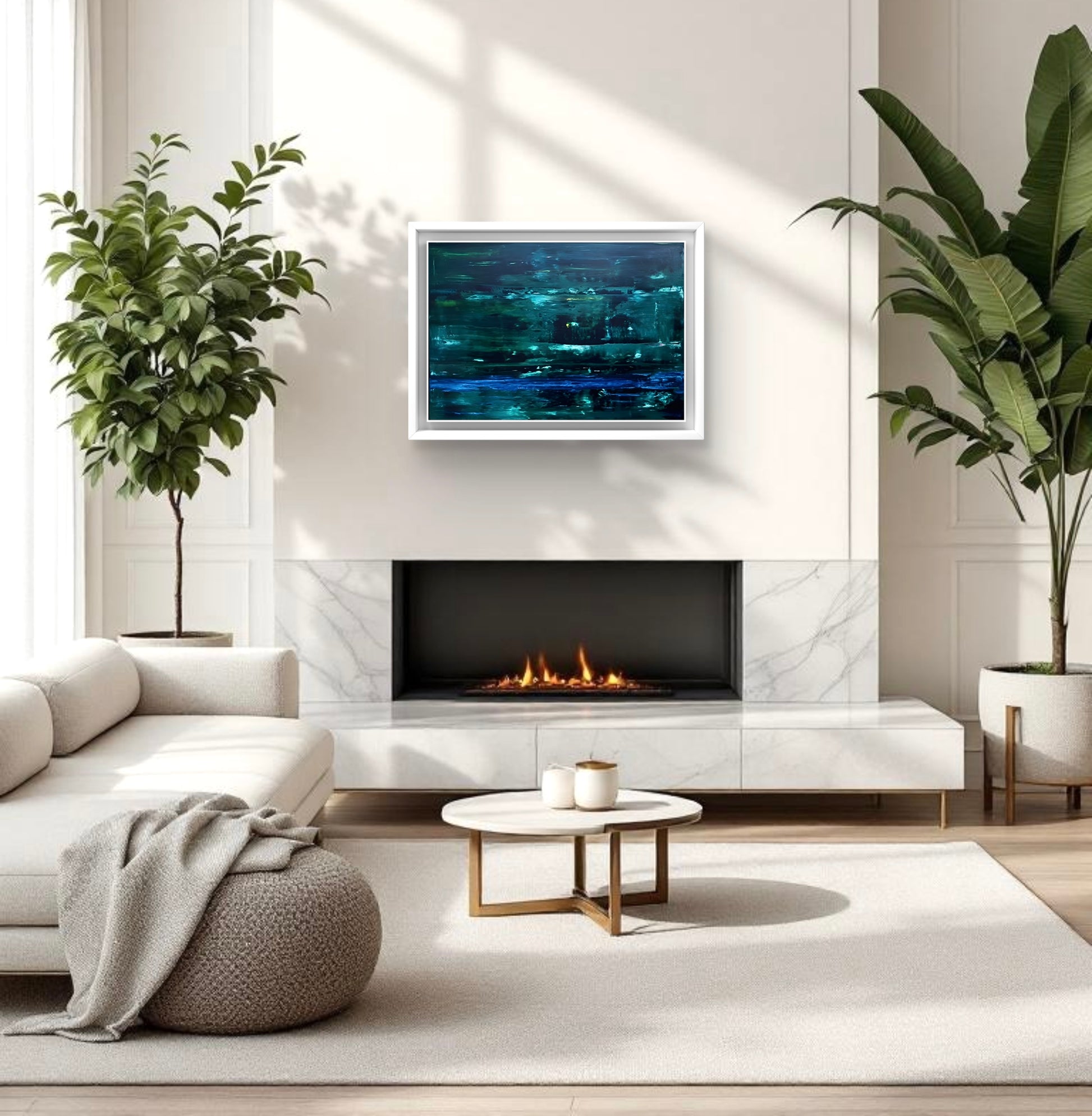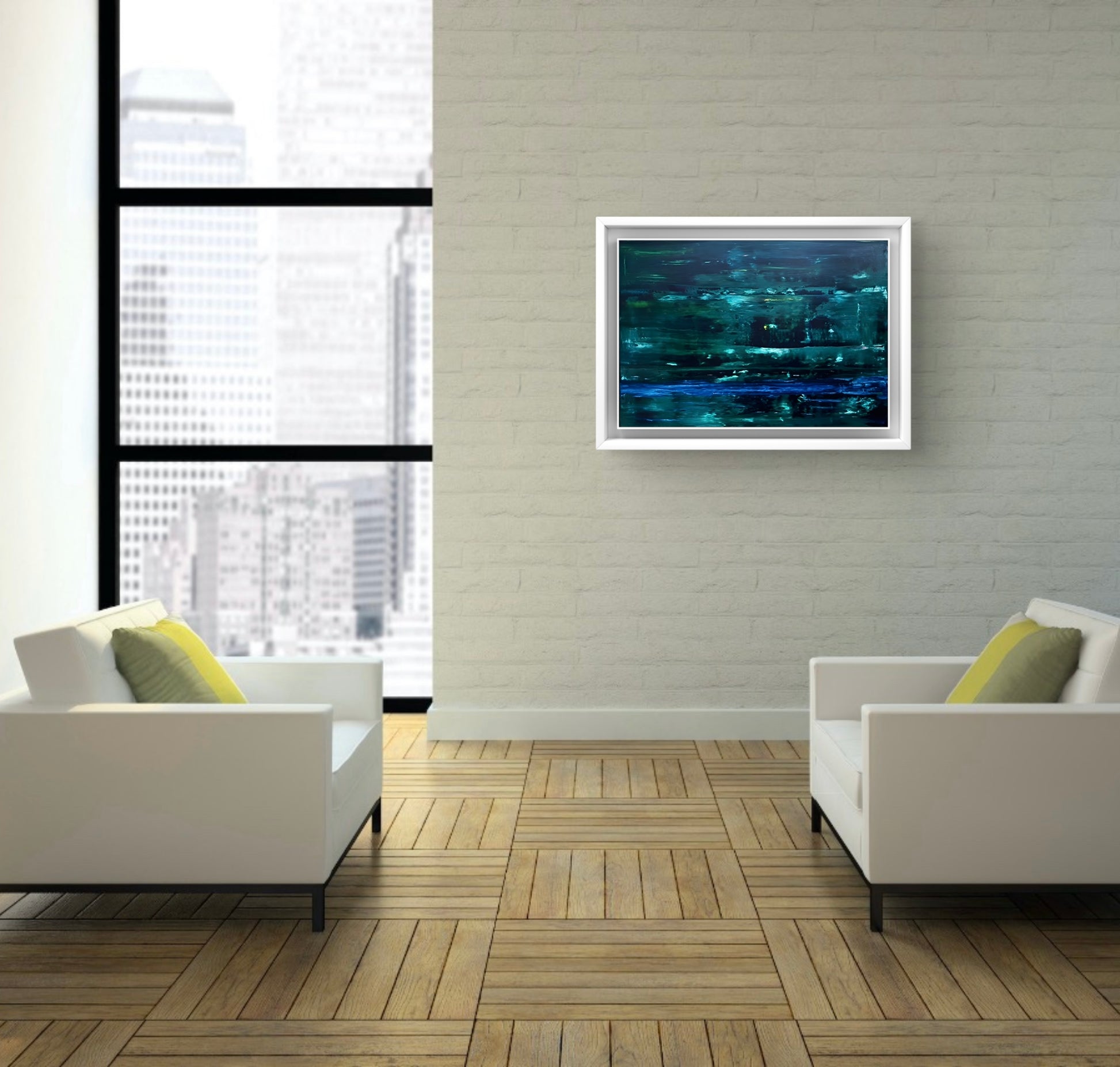 An abstract oil painting in shades of dark and light green with accents of blue, framed in a white solid wooden frame.