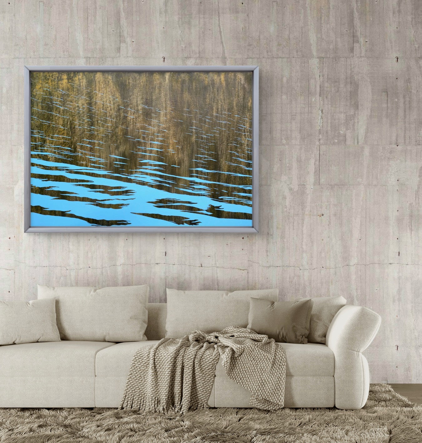 Dimension: 90 x 130 cm, framed 95 x 135 cm (framed in grey wood)