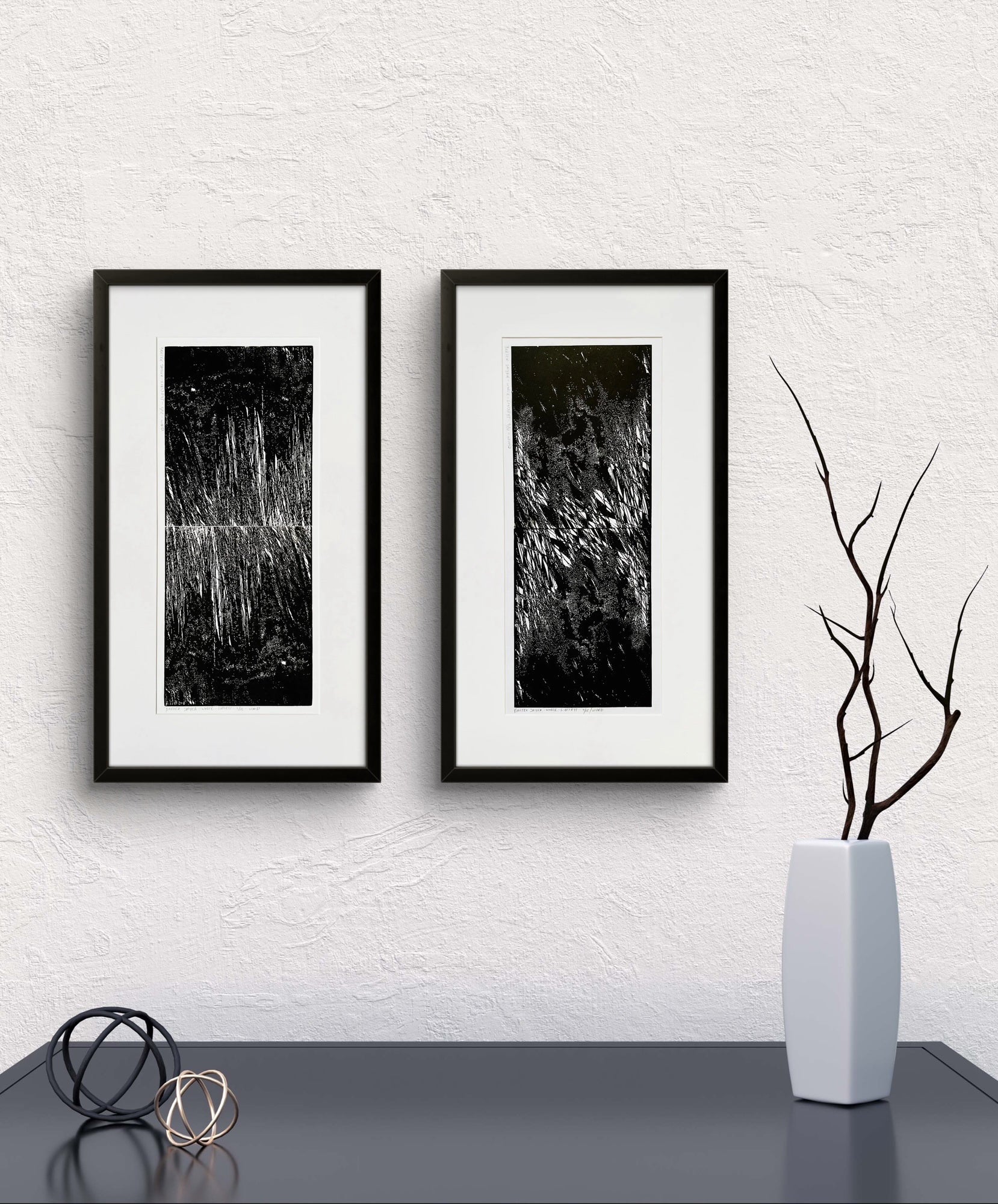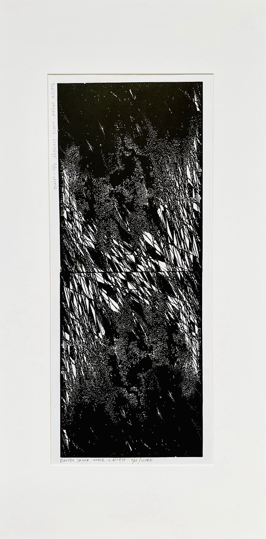 A black and white image of a linocut print, featuring abstract geometric patterns.
