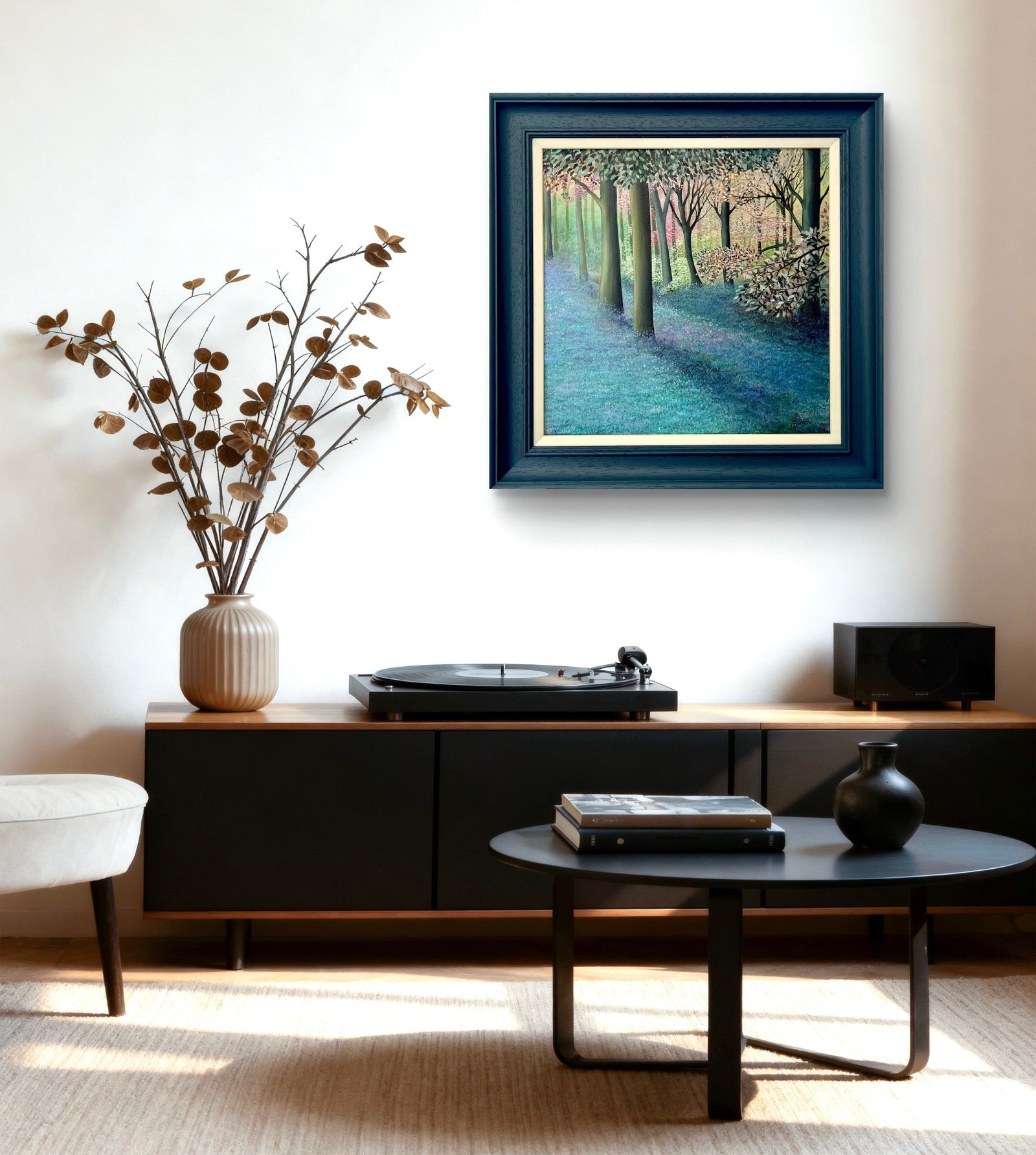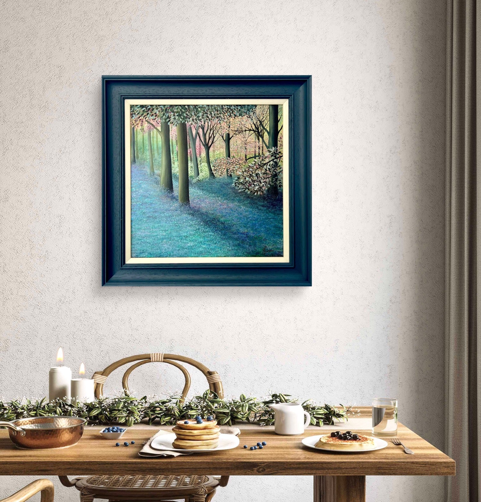 Framed in a navy wooden frame